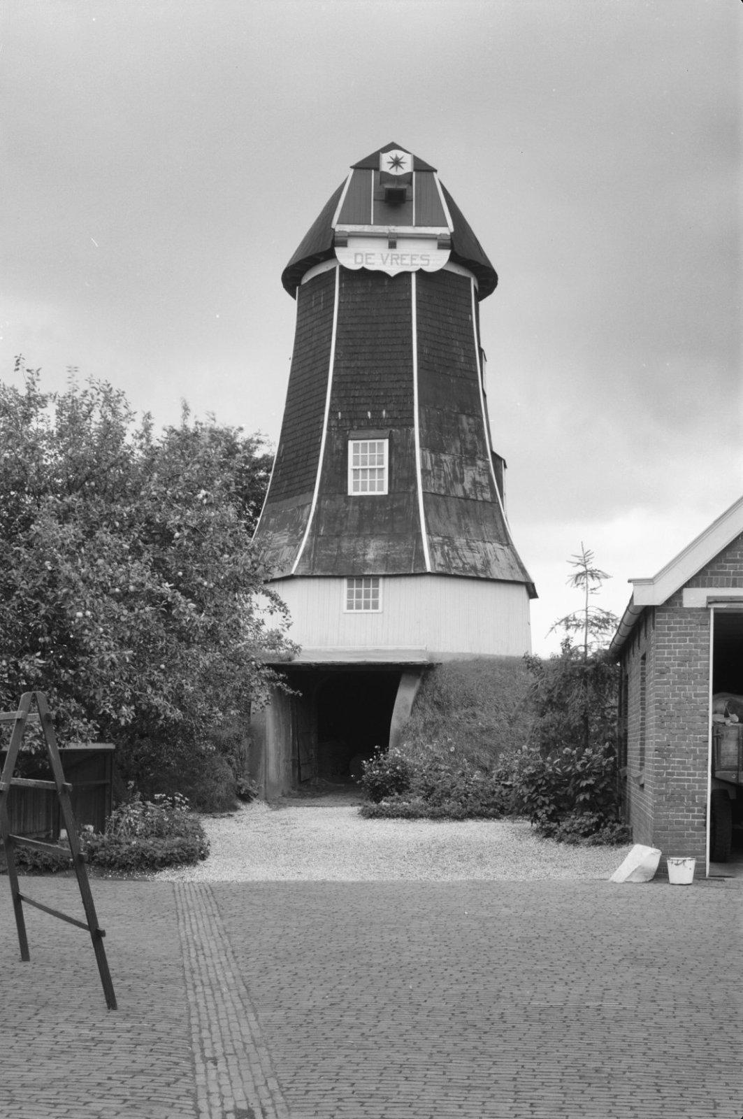 Onttakelde achtkante beltmolen van voren gefotografeerd