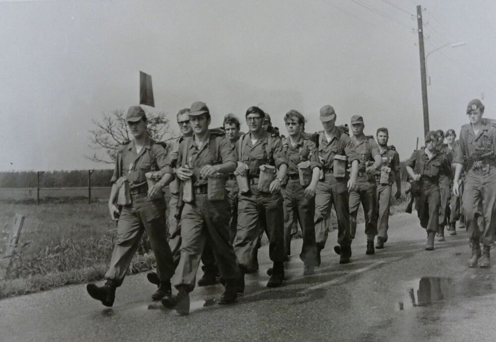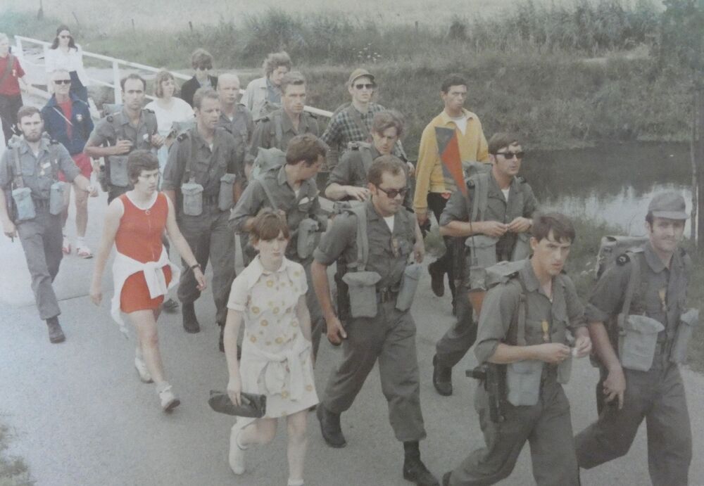 Peloton militairen vergezeld van burgers tijdens de ...