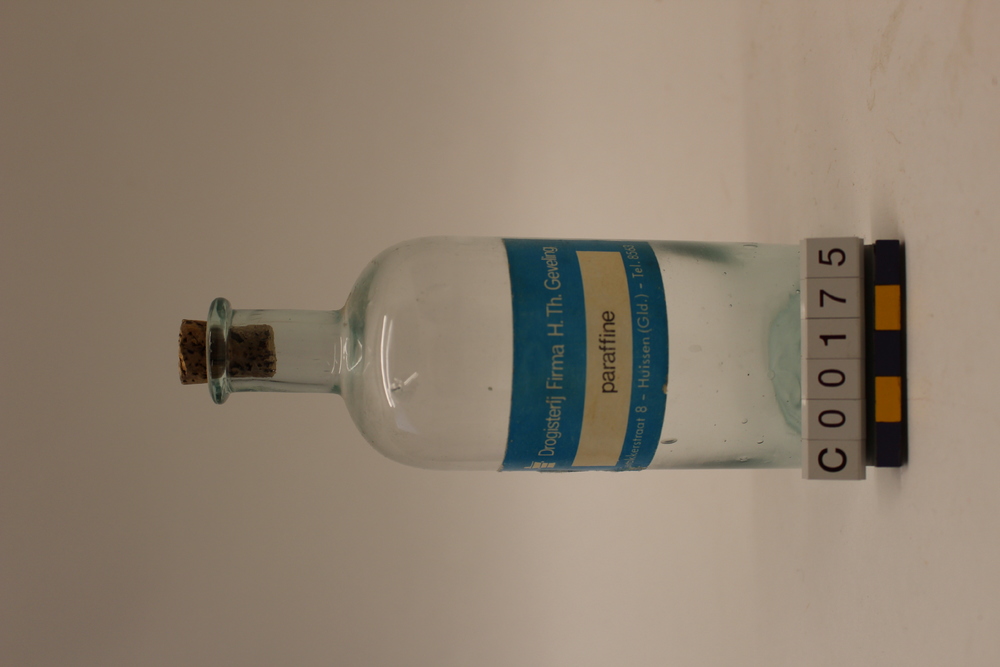 Lege fles paraffine 250 cl. met kurk van drogisterij...