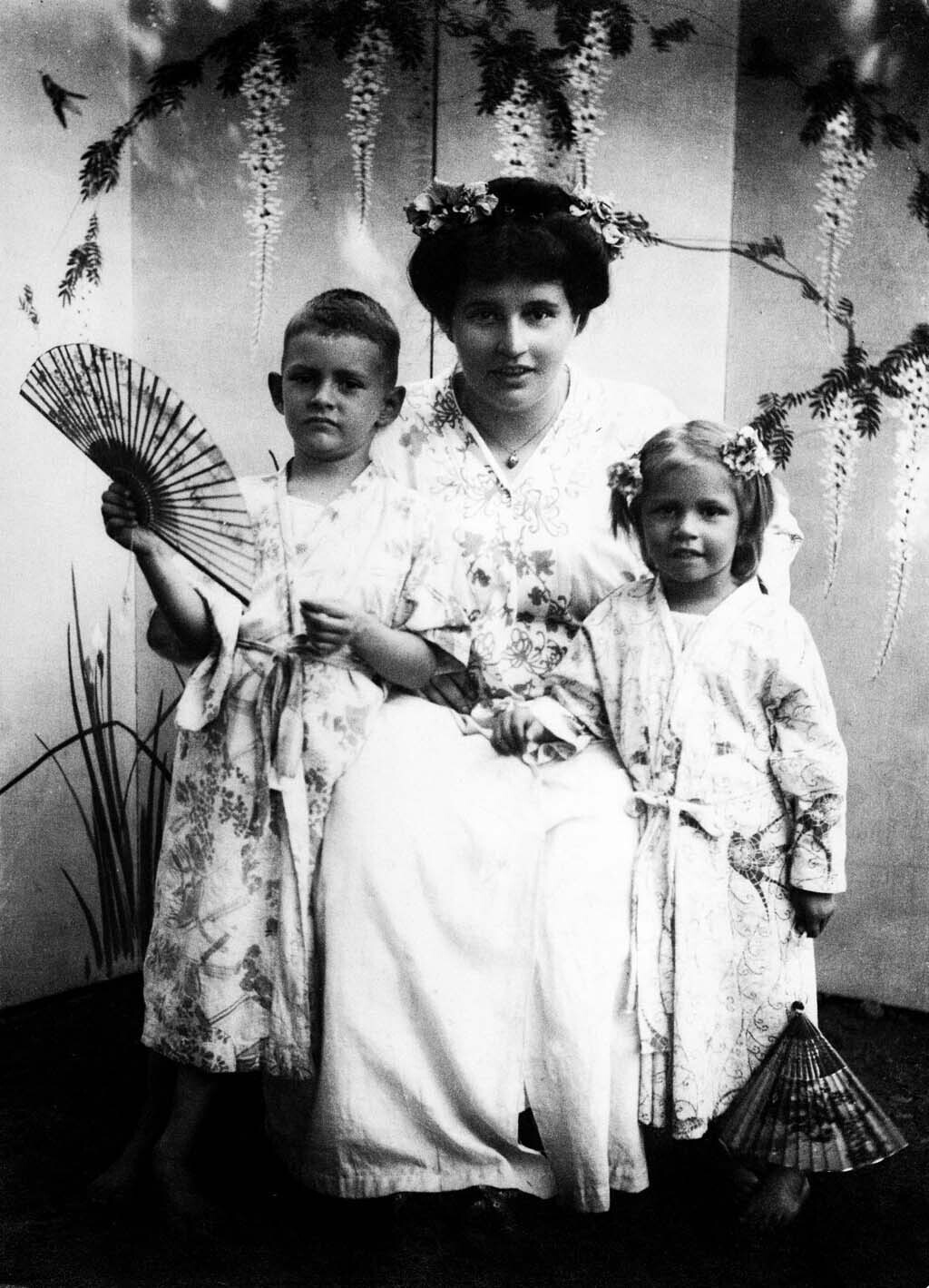 Portret van een moeder met twee kinderen in Japanse ...