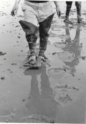Mannen op trippen op recent drooggevallen polderbode...