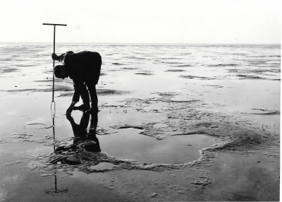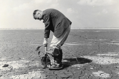 Man met grondboor op recent drooggevallen polderbode...