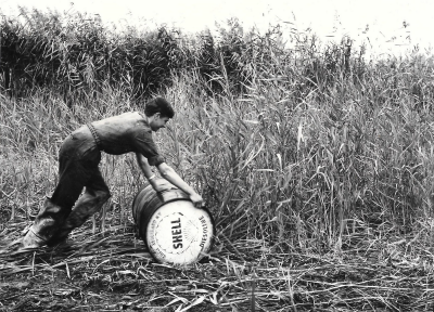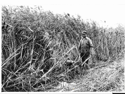 Man snijdt riet in Oostelijk Flevoland, eind jaren v...