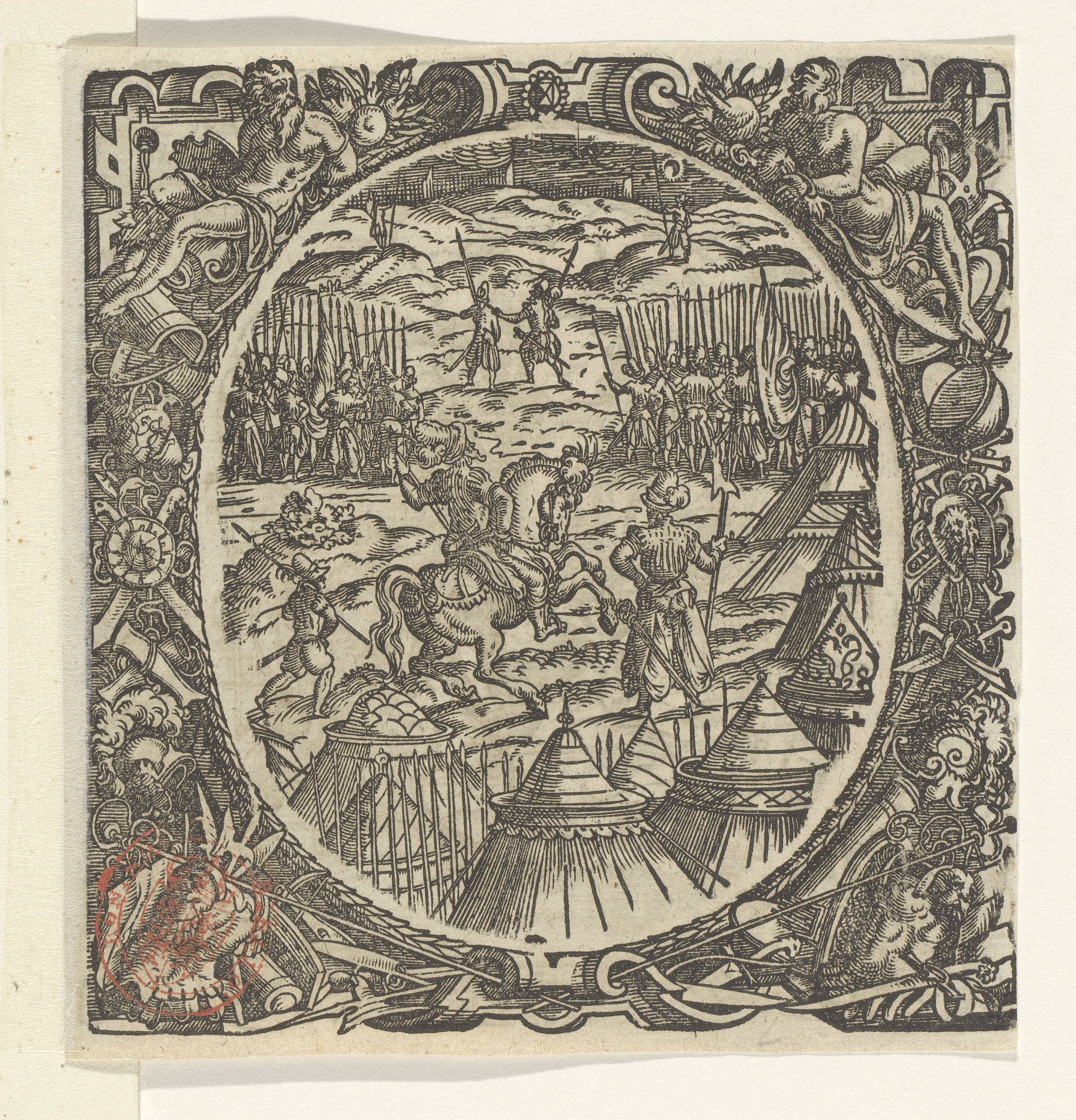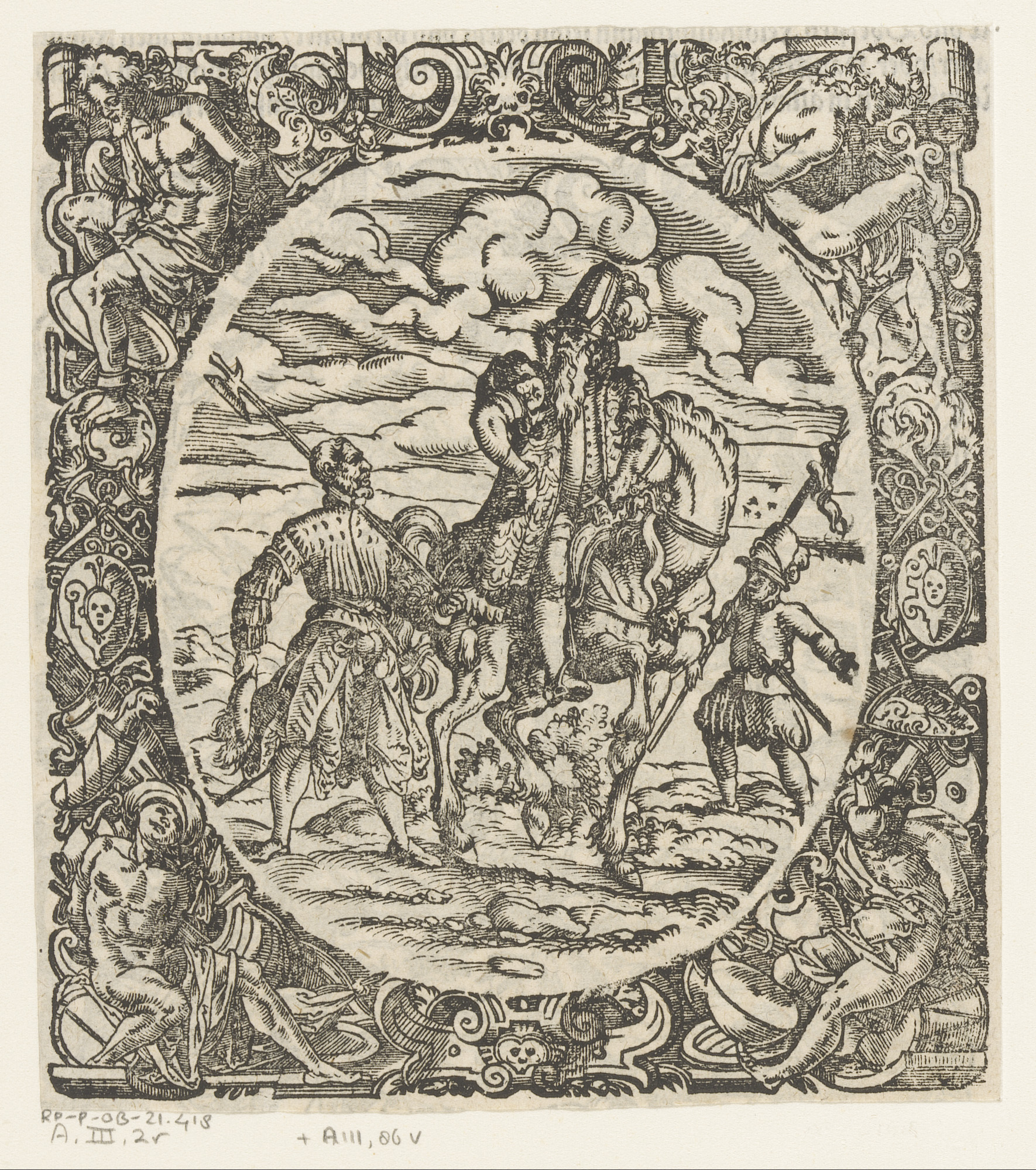 Generaal te paard met twee soldaten