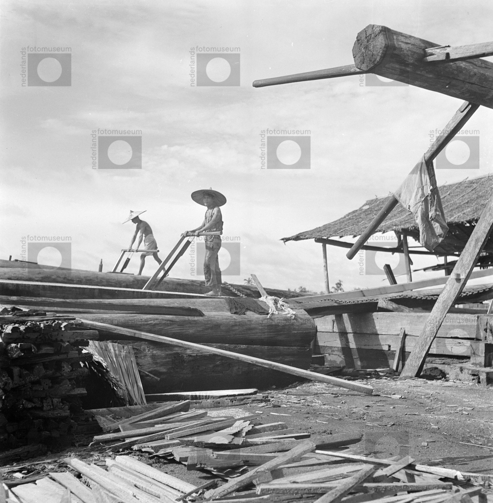 Op een inheemse scheepswerf langs een rivier zagen t...