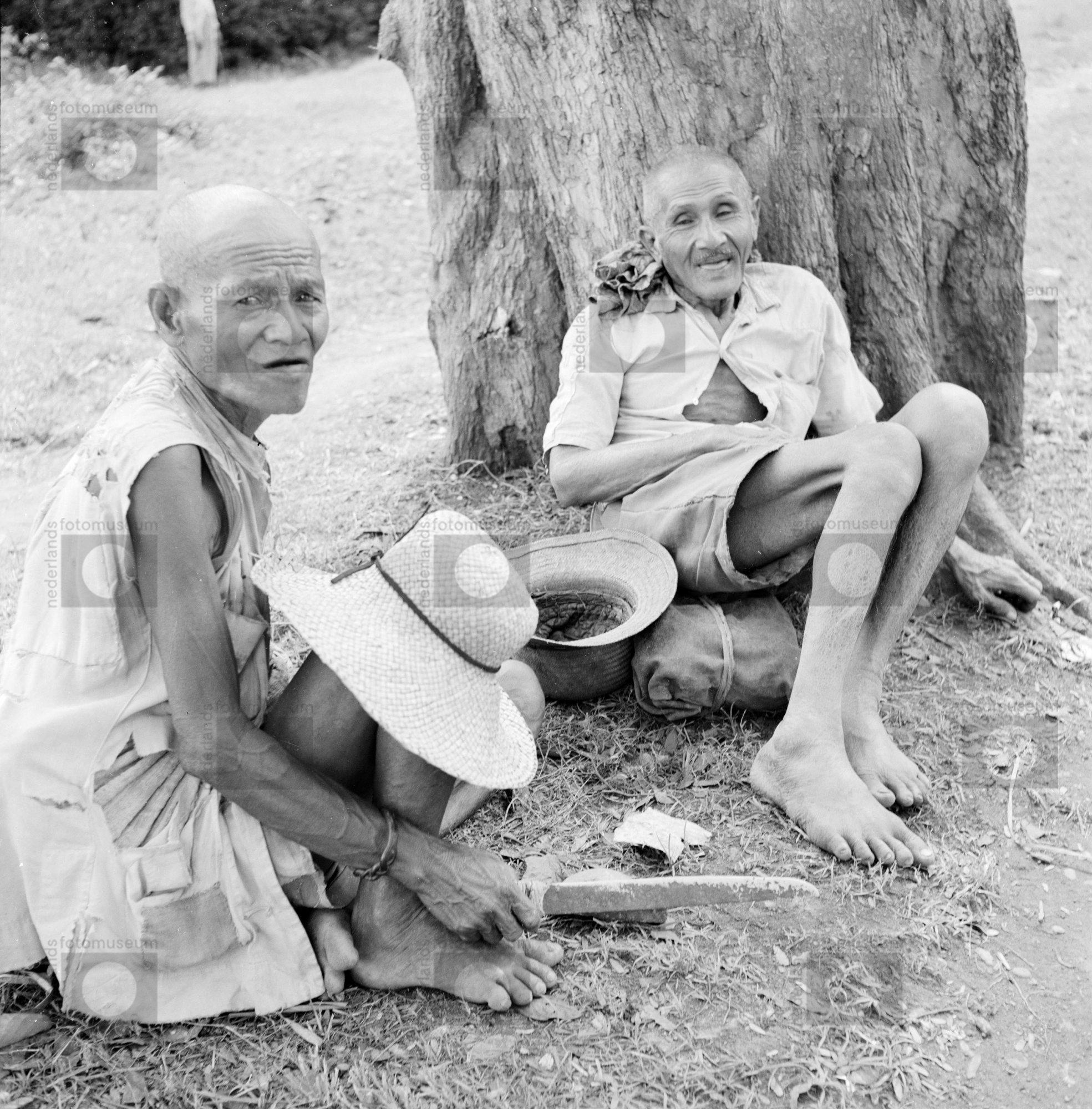 Twee oude arme mannen zitten onder een boom, Indones...