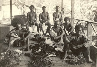 Mannen op een veranda maken huiden van paradijsvogel...