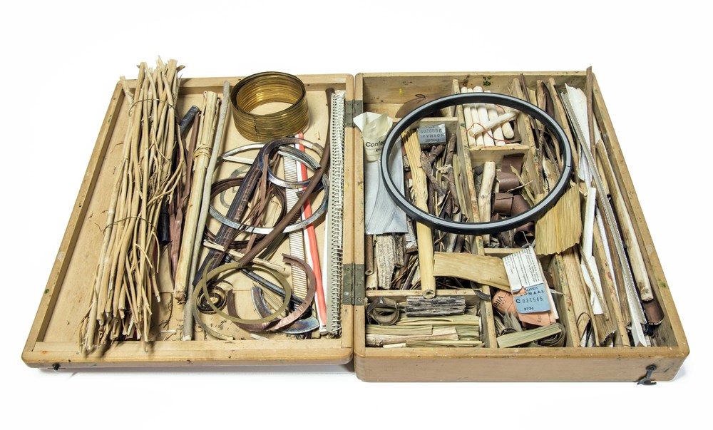 Opengeslagen houten kist met inhoud, van Onno Boekho...