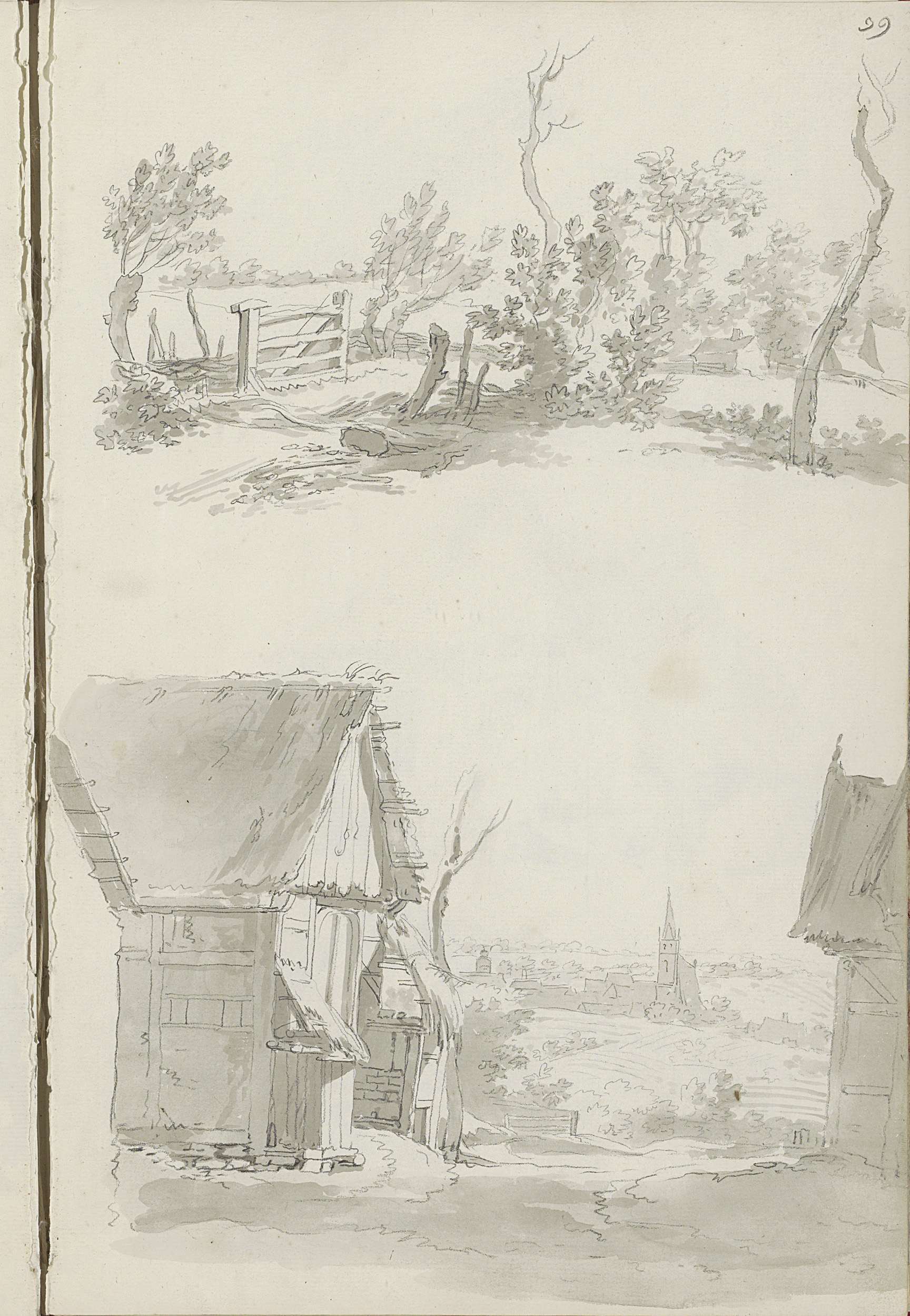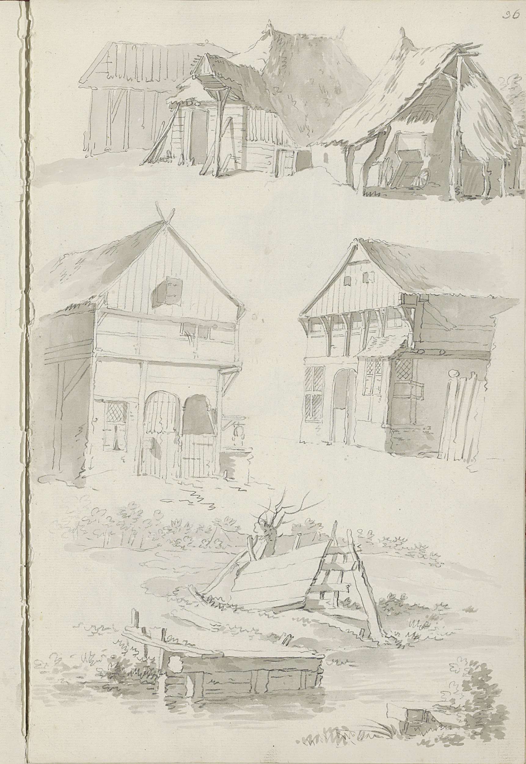Boerderijen, schuren en een landschap met water
