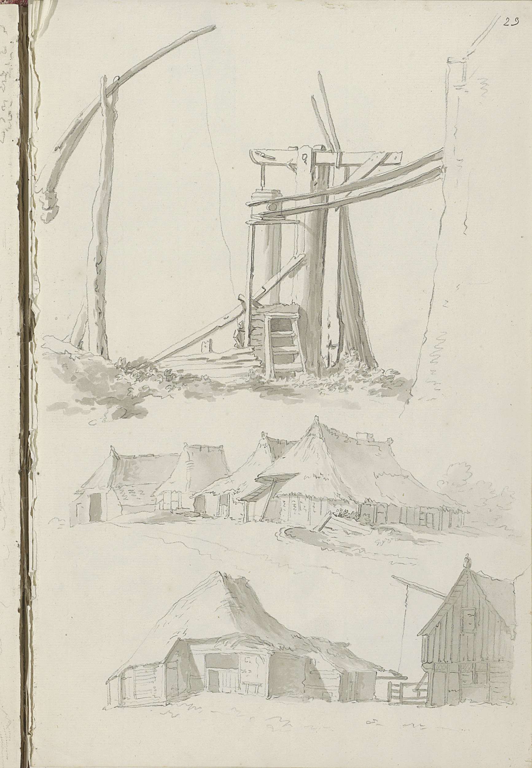 Waterput met hefboom en boerderijen