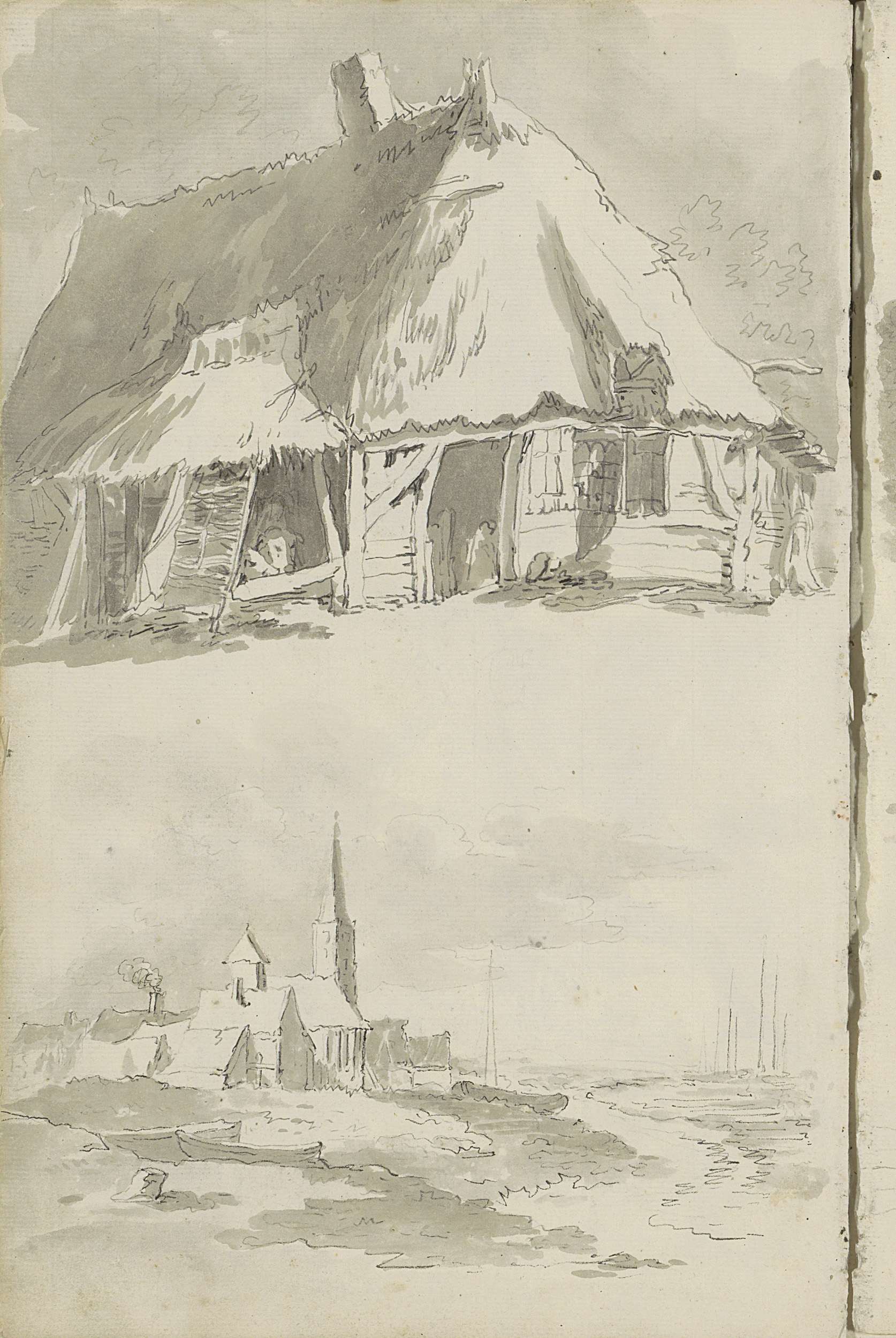 Boerenschuur en gezicht op een stad aan het water