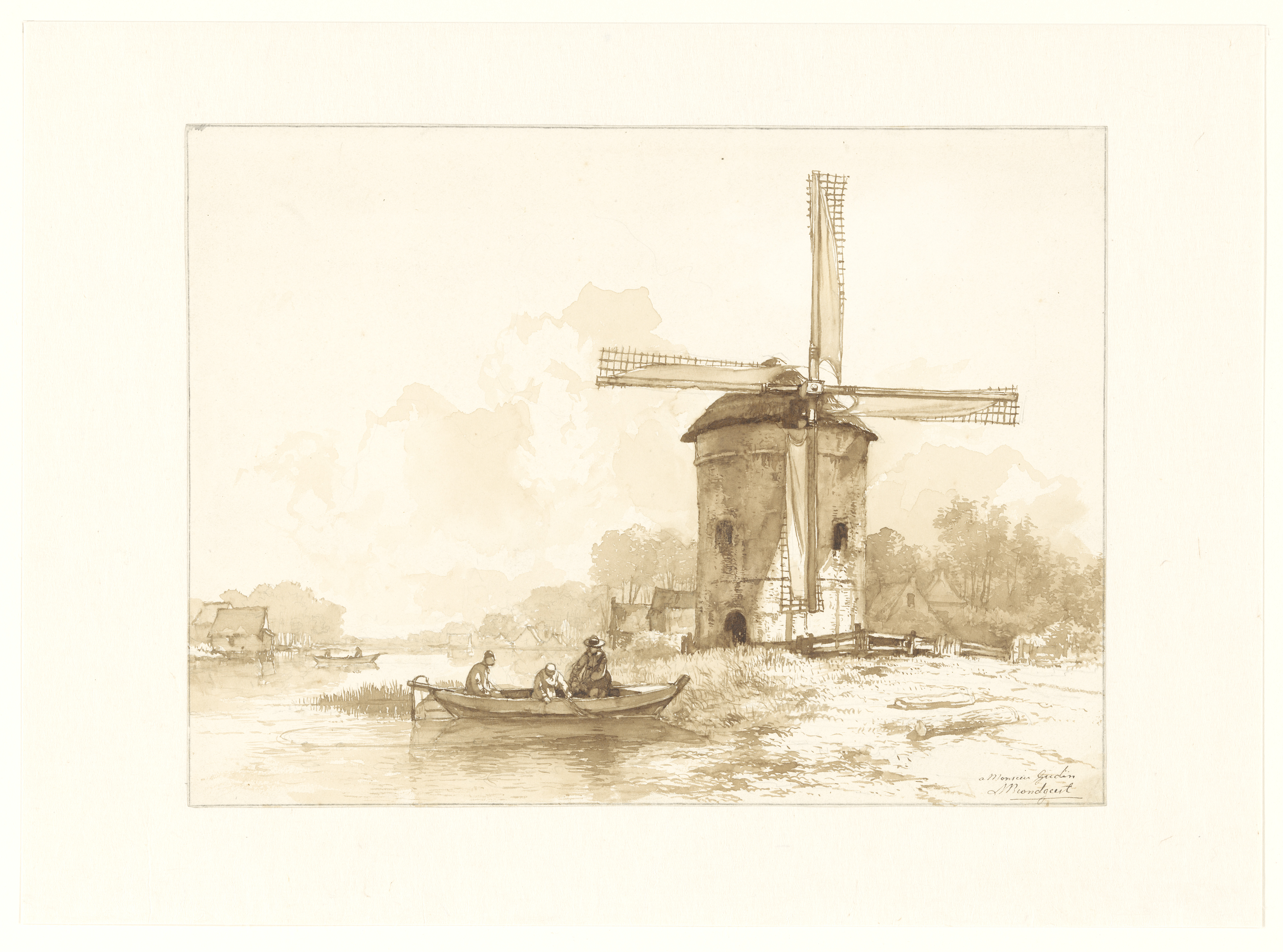 Molen op een heuvel aan een waterkant