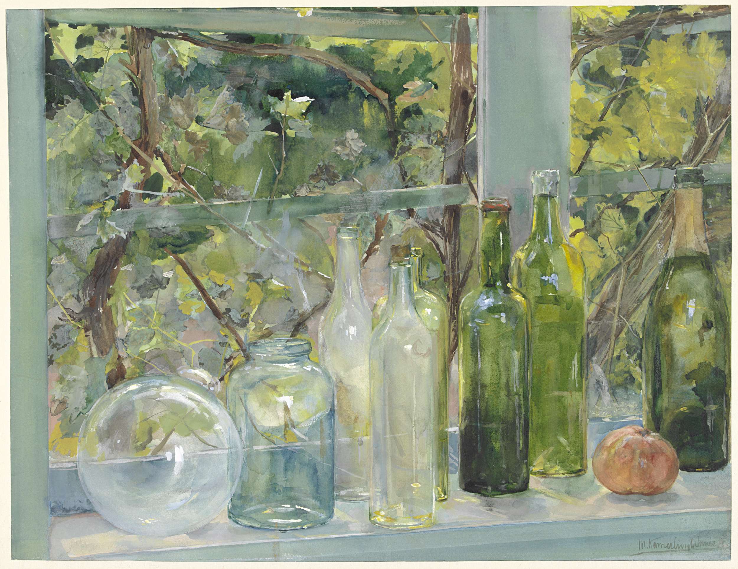 Windowsill with Bottles, a Glass Globe and an Apple