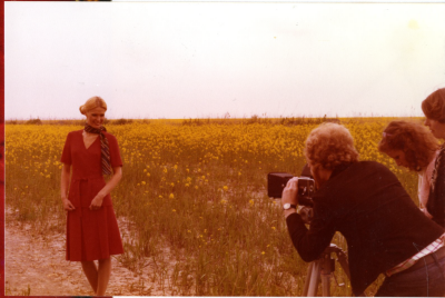 Fotograaf in koolzaadveld in Zuidelijk Flevoland bez...