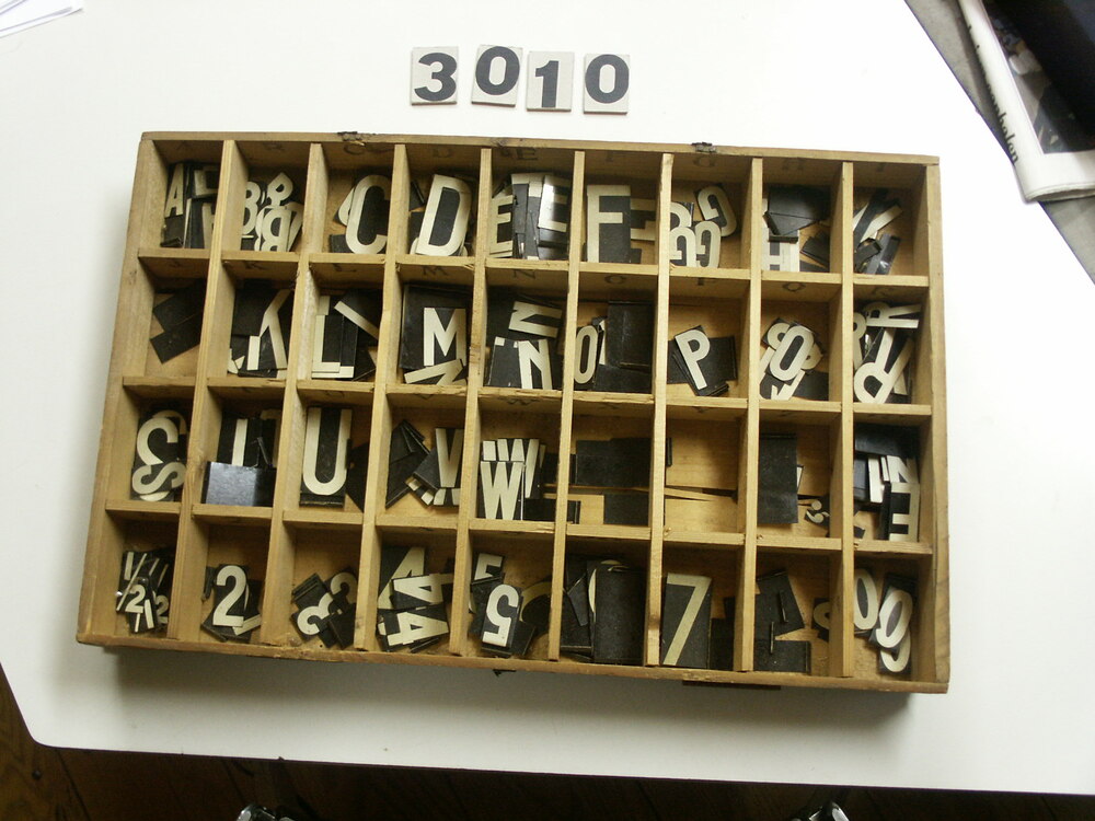 letterdoos van hout met blikken plaatjes.