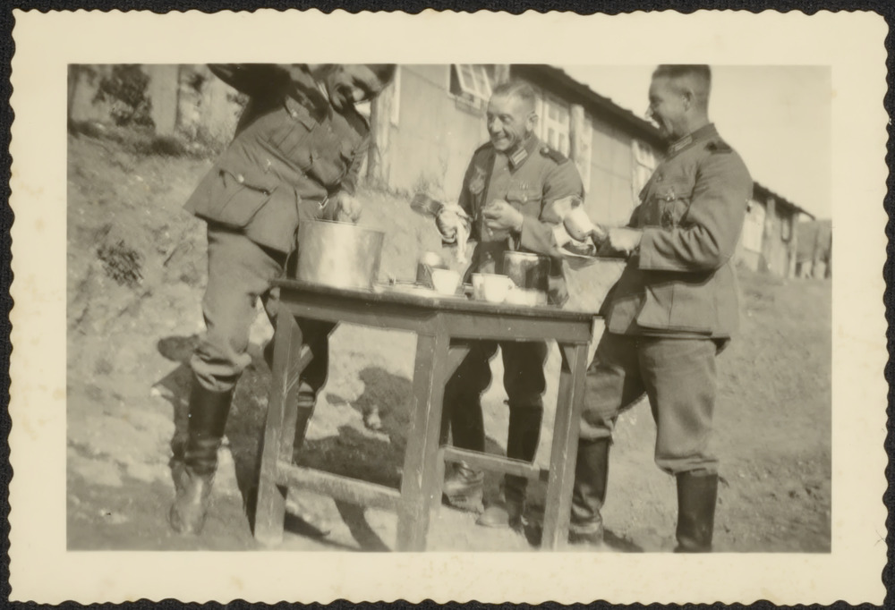 Drie militairen van de Duits Wehrmacht zijn eten aan...