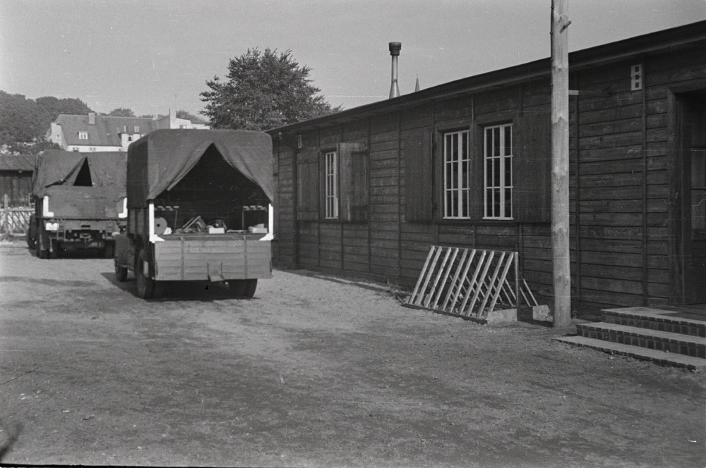 De vrachtwagens staan klaar bij een barak.
