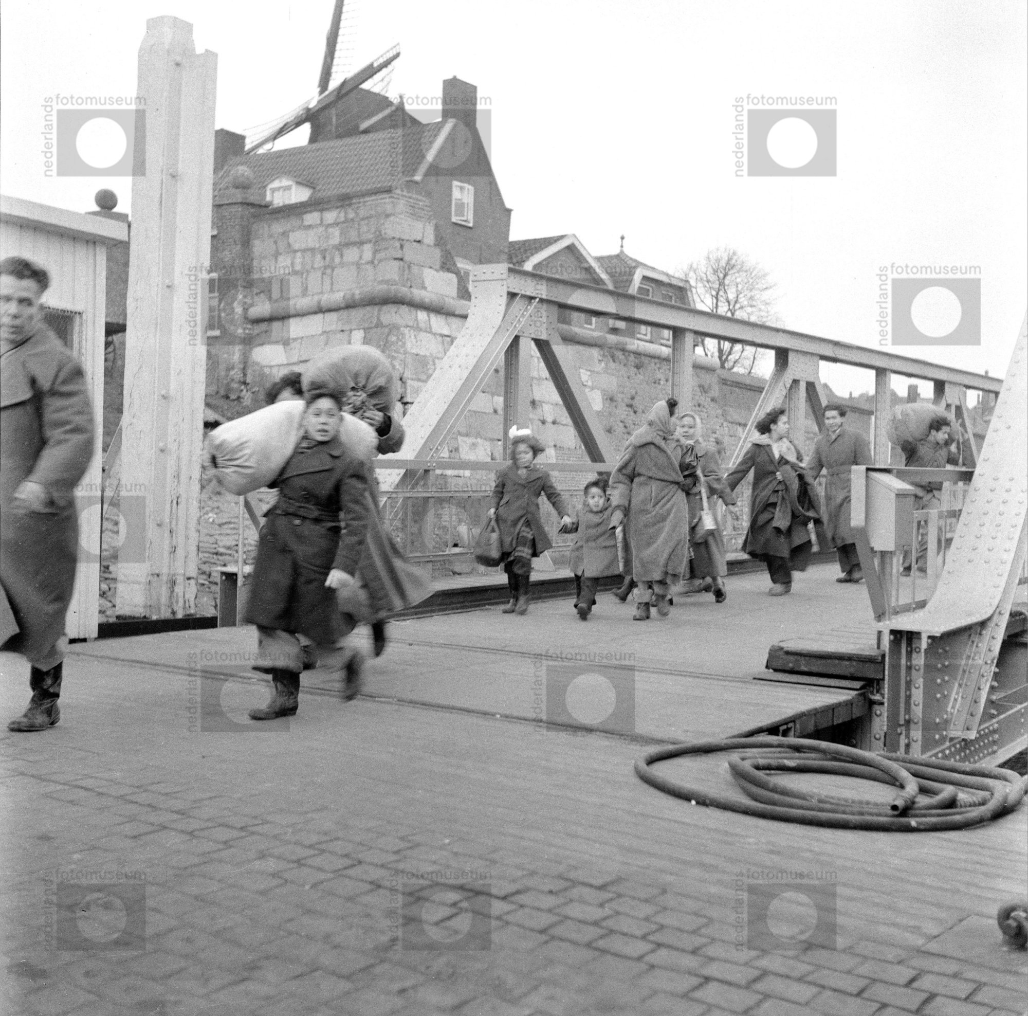 Evacués dragen hun bezittingen, Watersnoodramp, (ver...