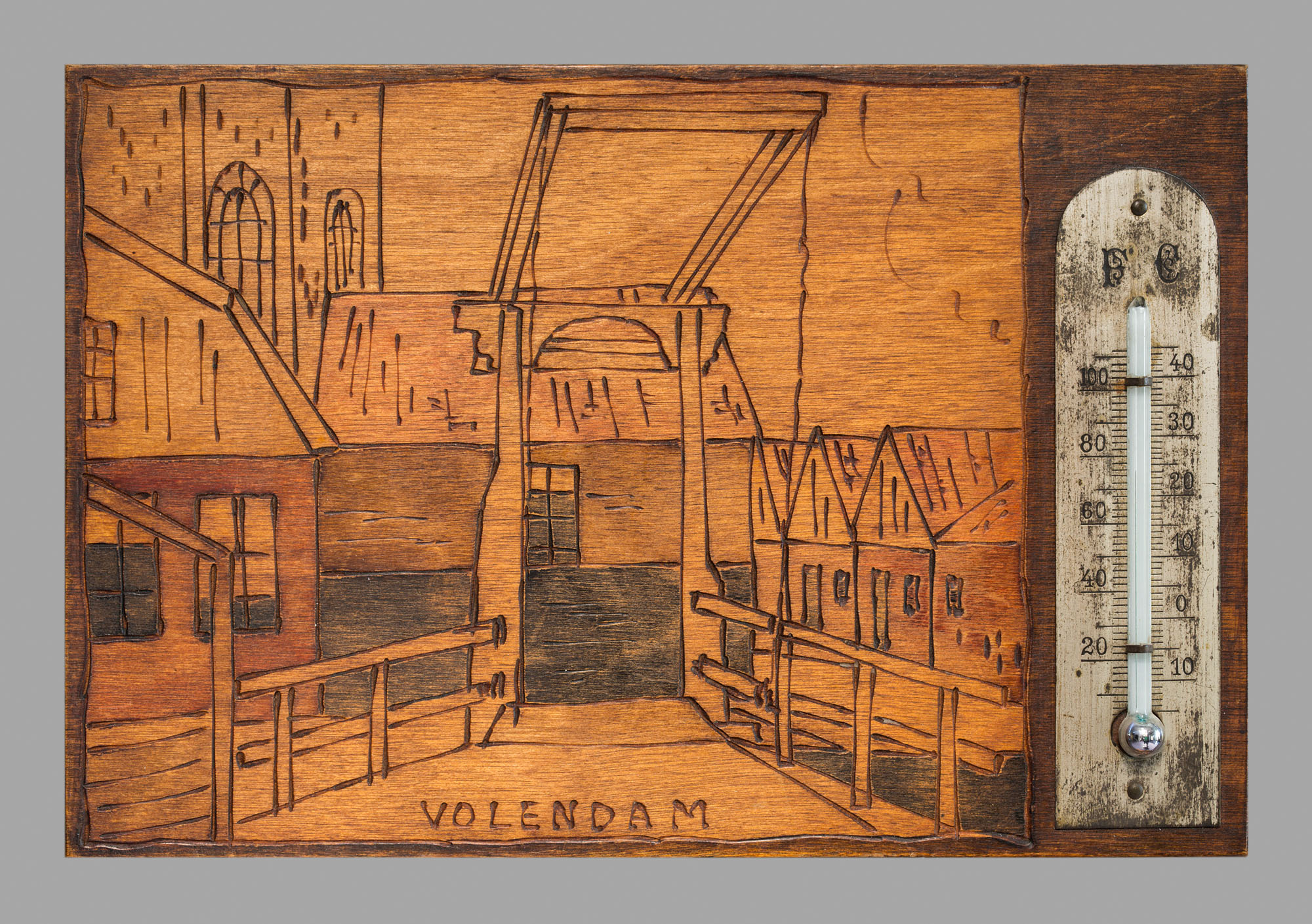 Afbeelding brug te Volendam. gesneden in hout met th...