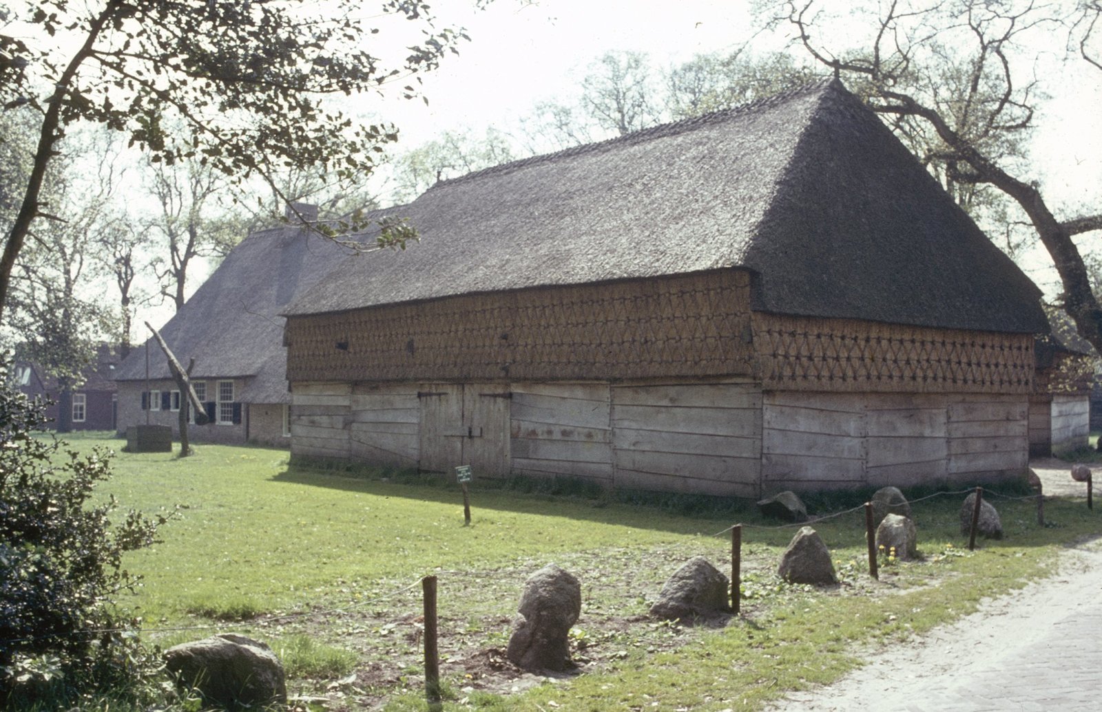 Overzicht schaapskooi met decoratief vlechtwerk op d...