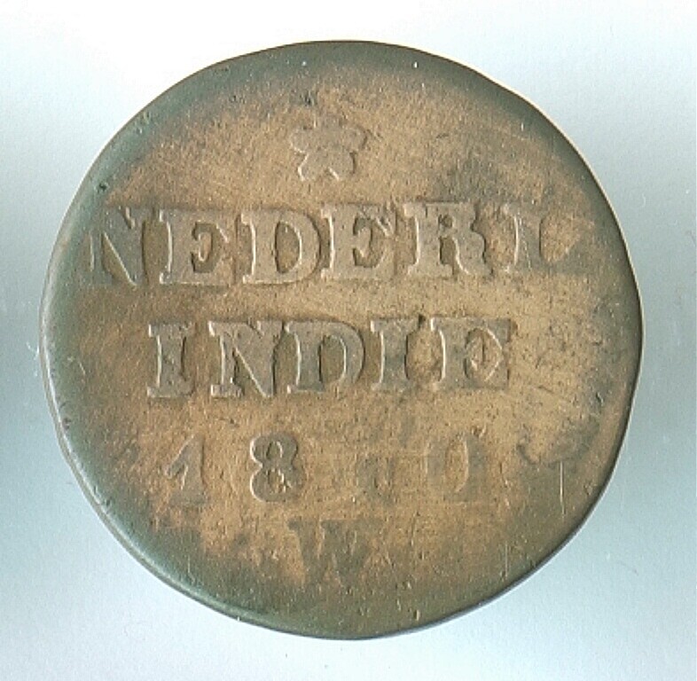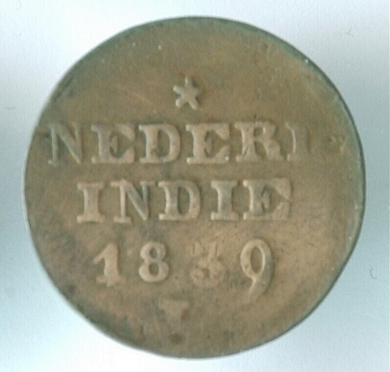 Koperen duit van de V.O.C. met het wapen van Holland