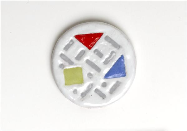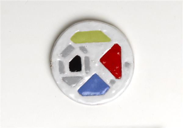 Ronde tegel bedoeld voor sieraad; wit met rood, geel...