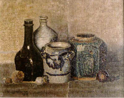 Stilleven met groene fles, soja-kruik en Keuls potje
