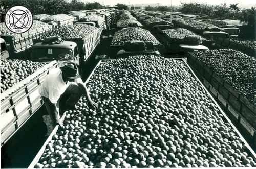 Vrachtwagens volgeladen met sinaasappels