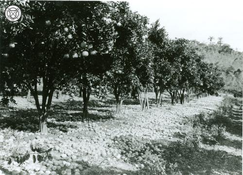Geoogste sinaasappels in ‘kooien’ op de boomgaard