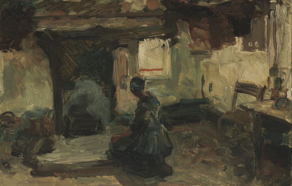 Interieur met boerin bij schouw
