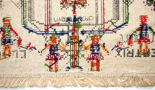 Merklap van stramien met een gezoomde en omgestikte ...