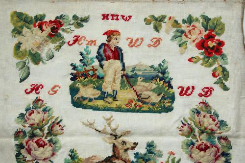 Borduurwerk linnen met wol, meisje met twee hondjes