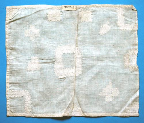 Merklap op fijn wit katoen. M.G. Post