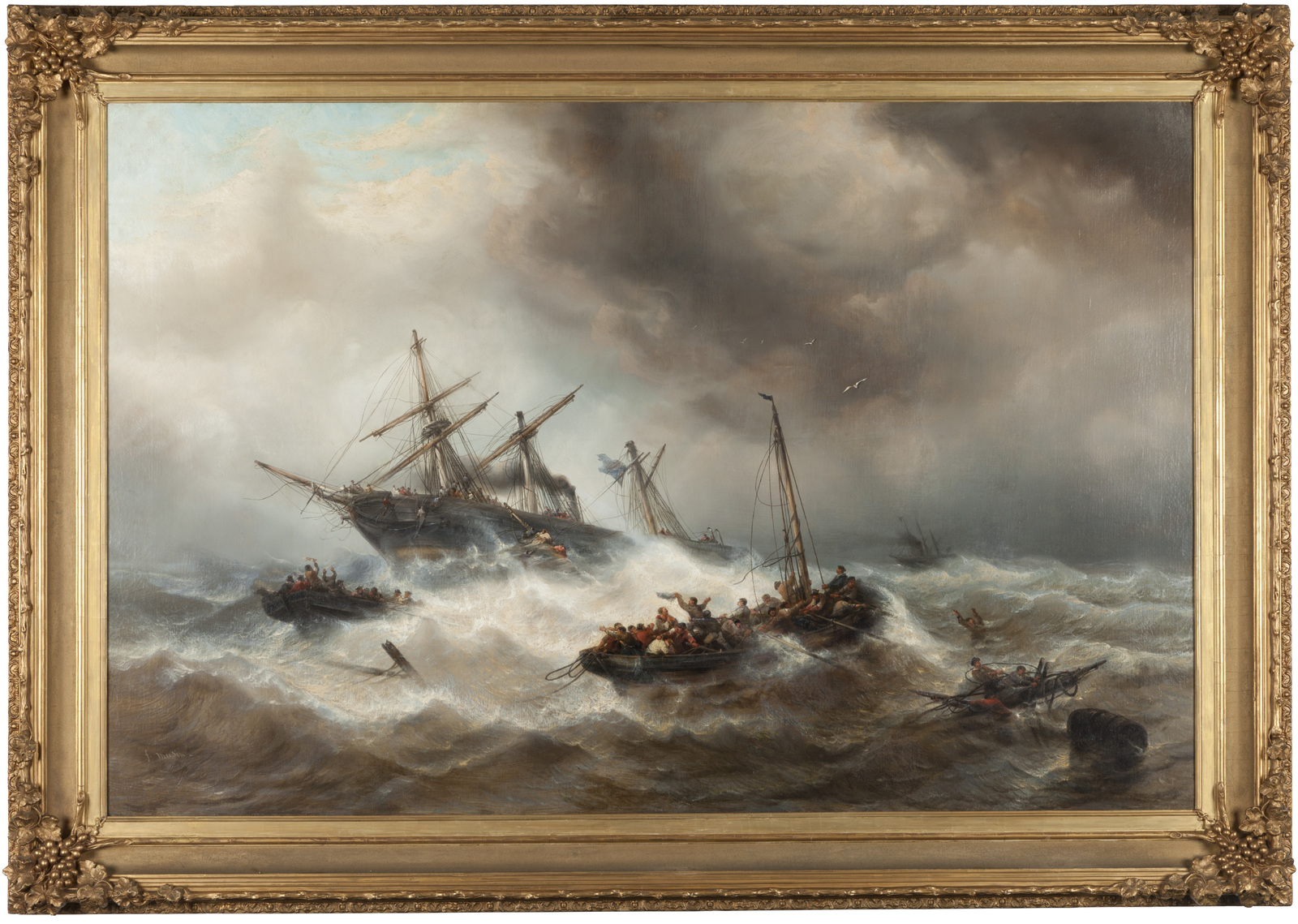 Een driemaster lijdt schipbreuk op een ruwe zee