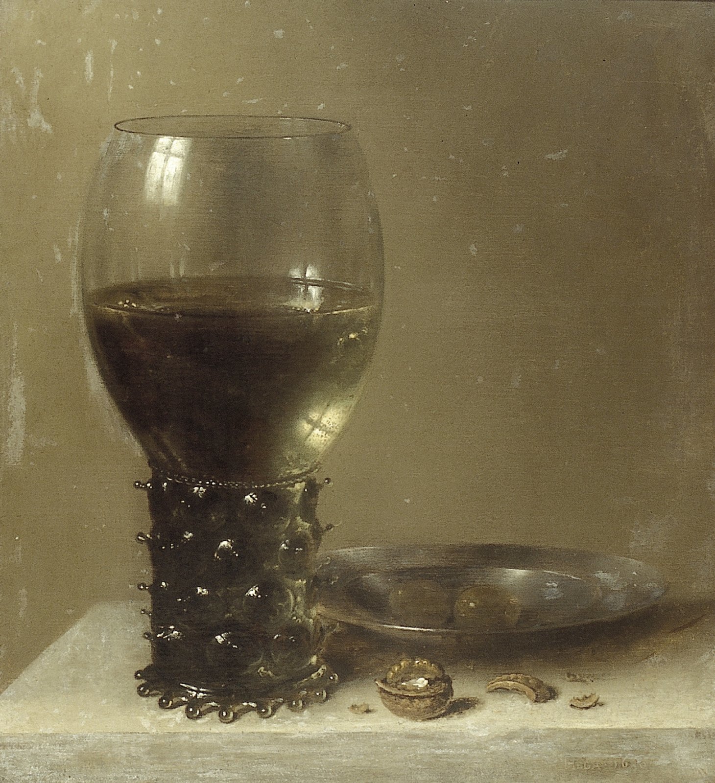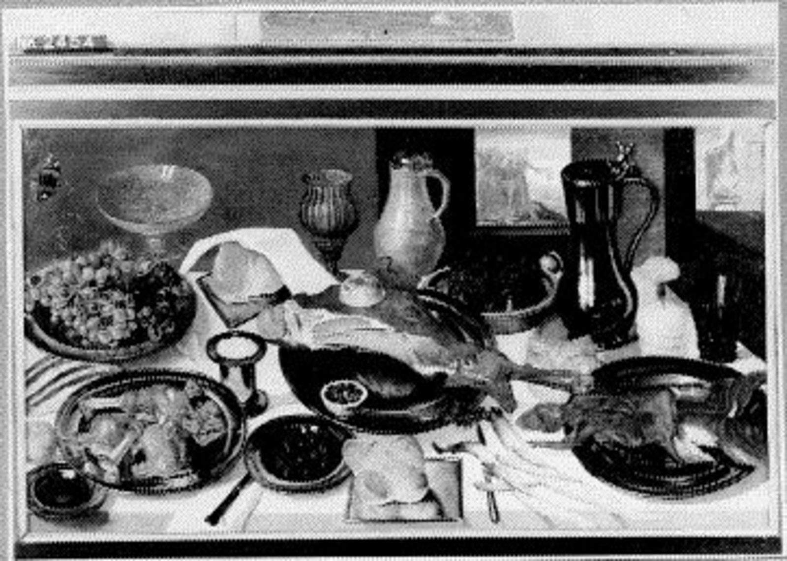 Stilleven met tinnen borden, vlees, druiven en olijven