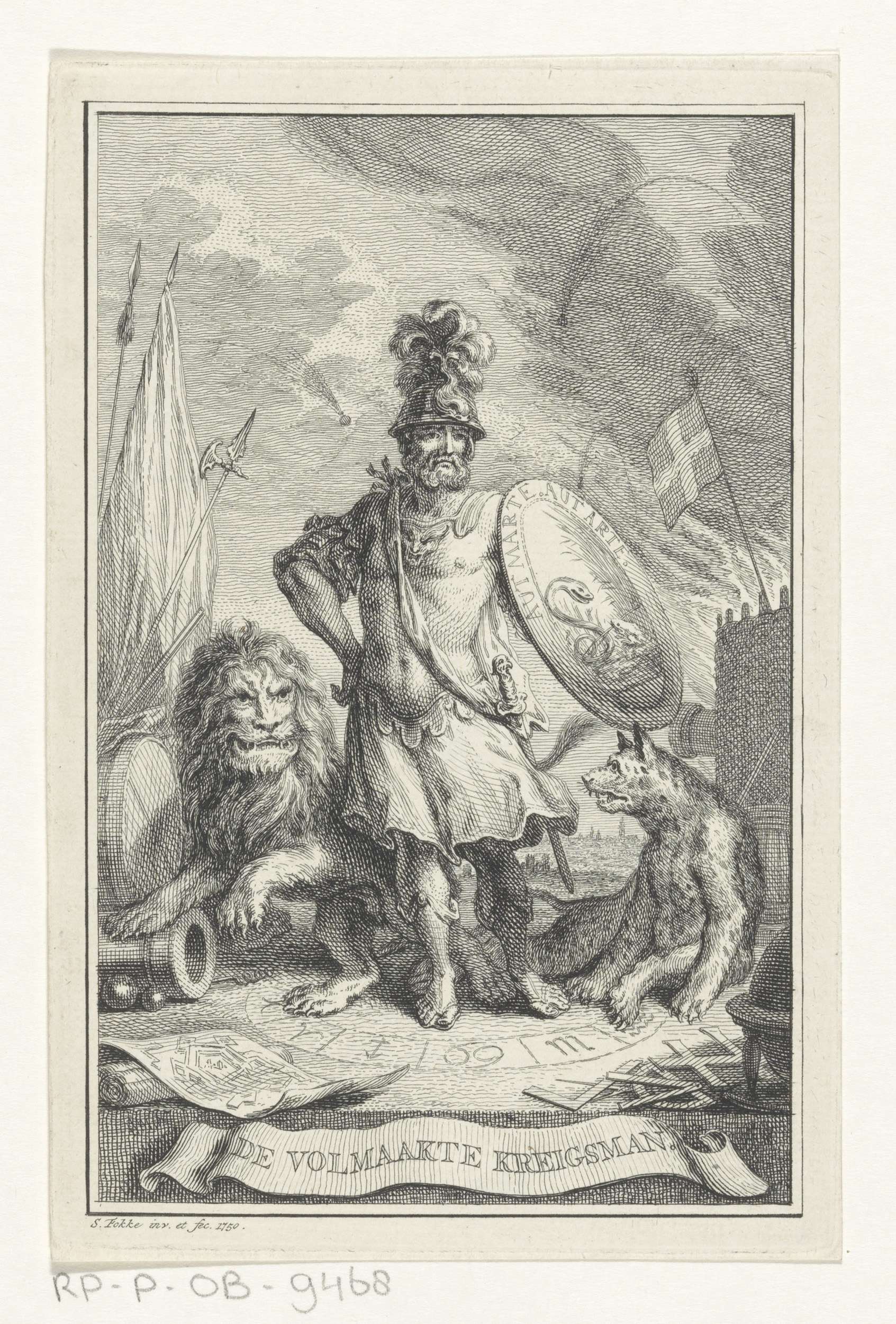 Krijgsman geflankeerd door een leeuw en panter