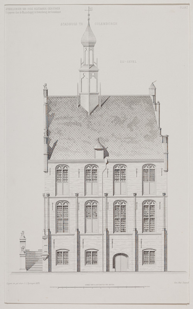 Litho, voorstellende de zijgevel van het stadhuis te...