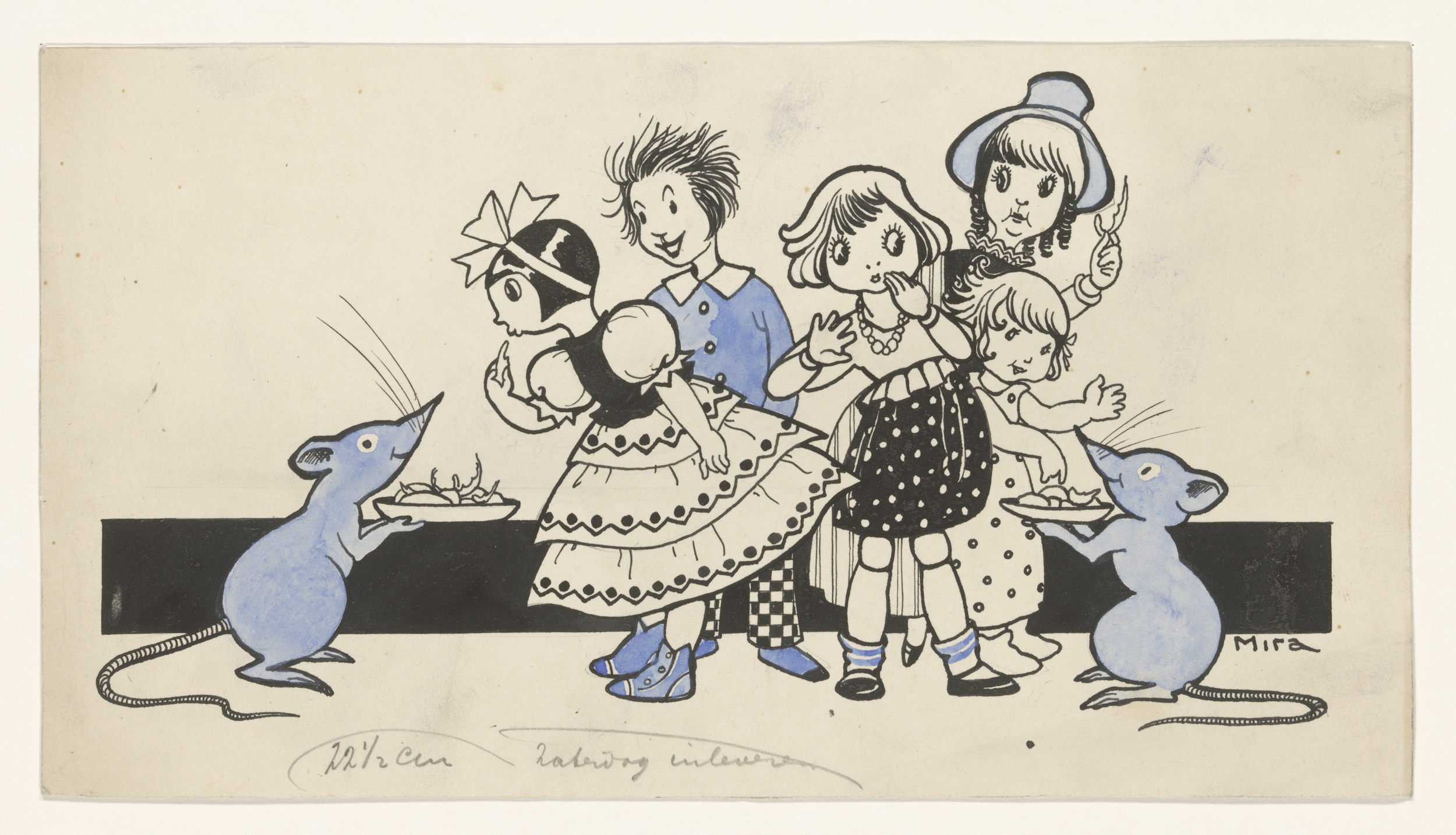 Muizen presenteren lekkernijen aan kinderen en poppen