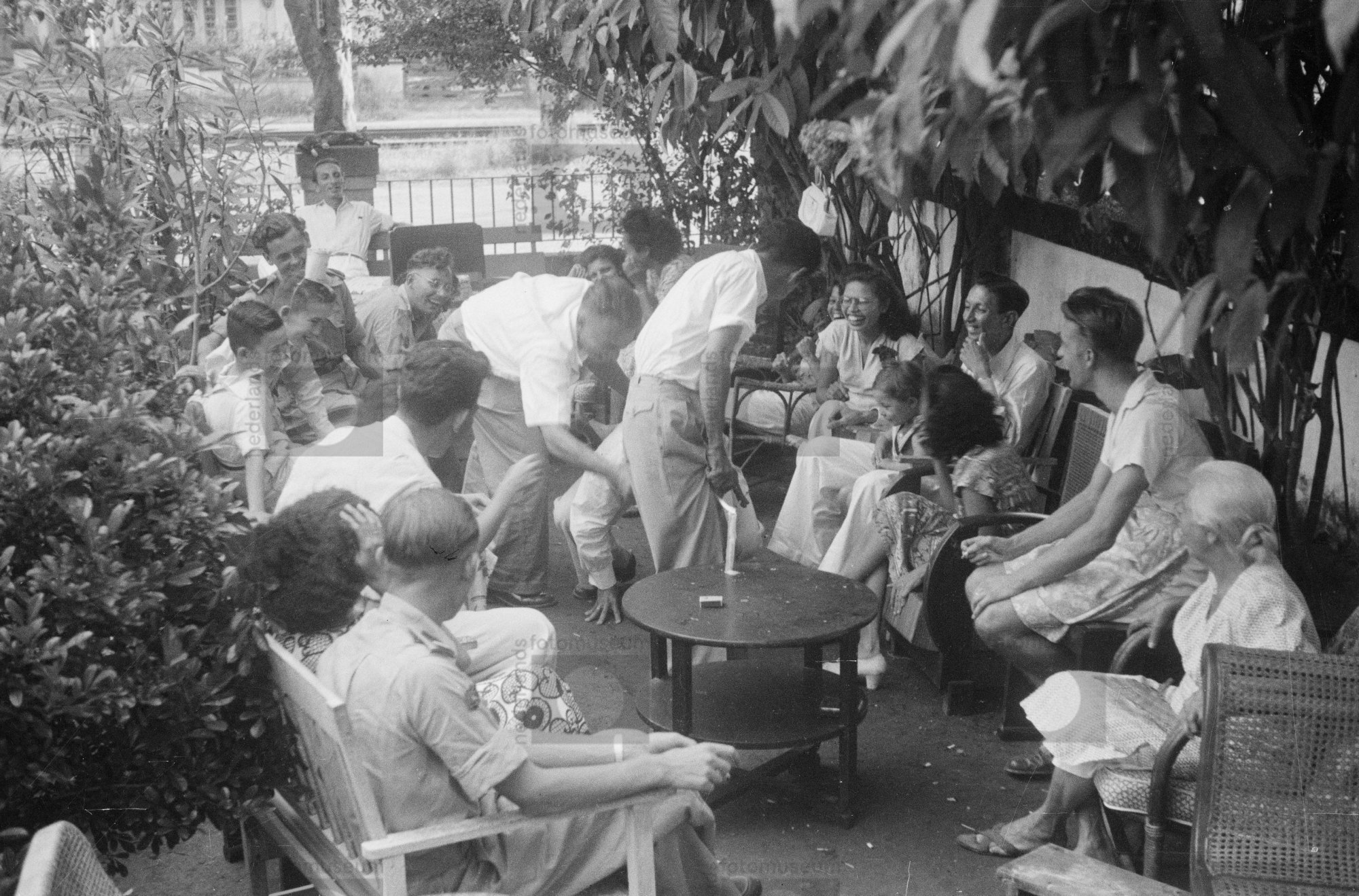 Feestje in de tuin van burger Ed Nuse aan de Reinier...