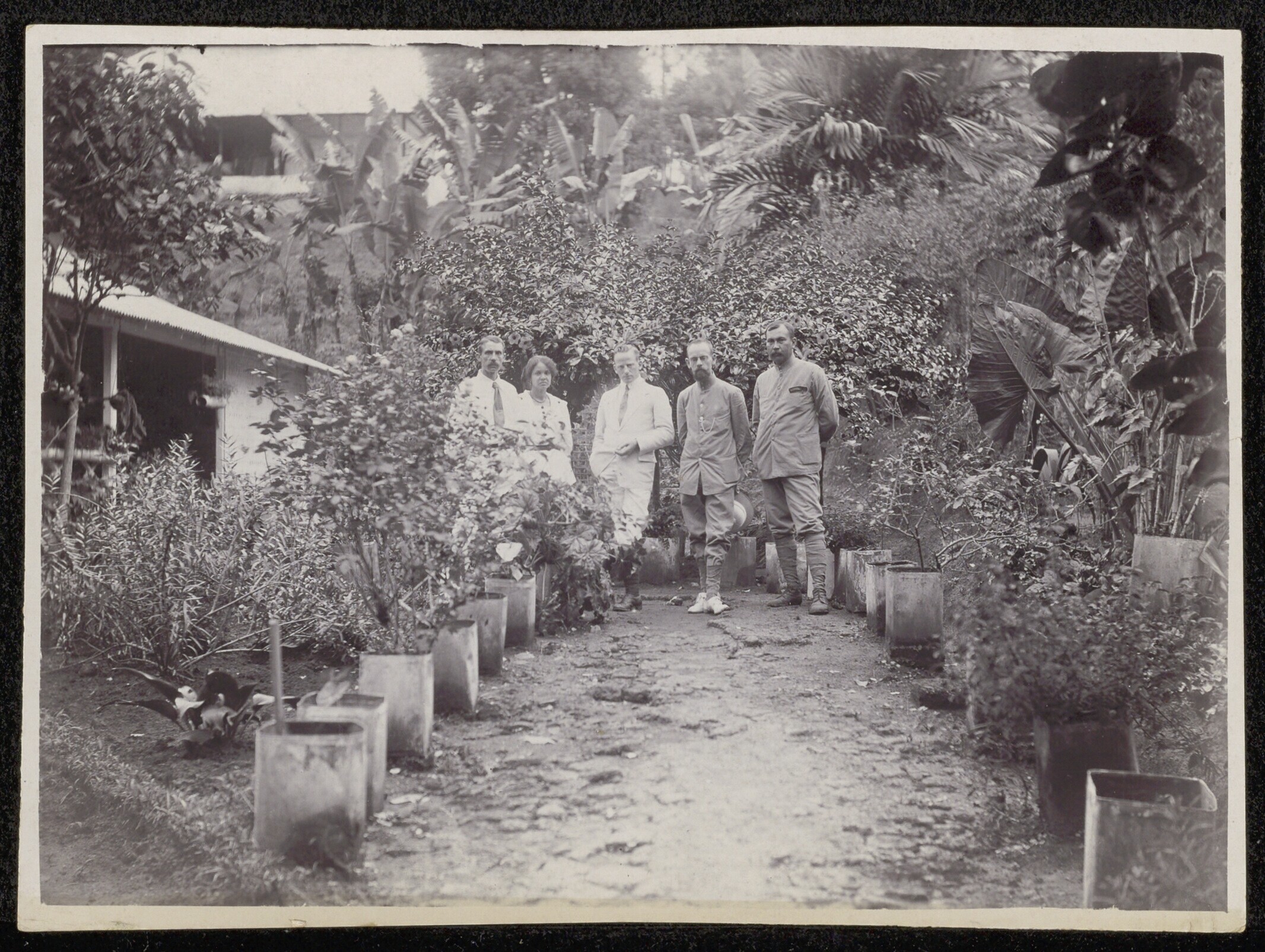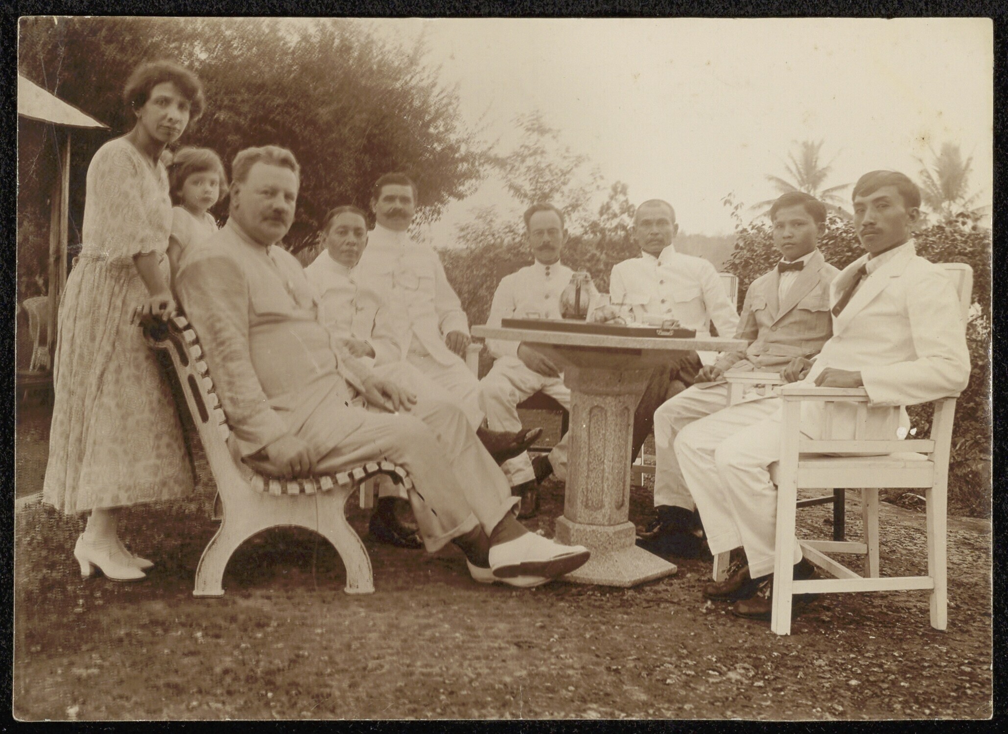 Groepsportret zittend in een tuin