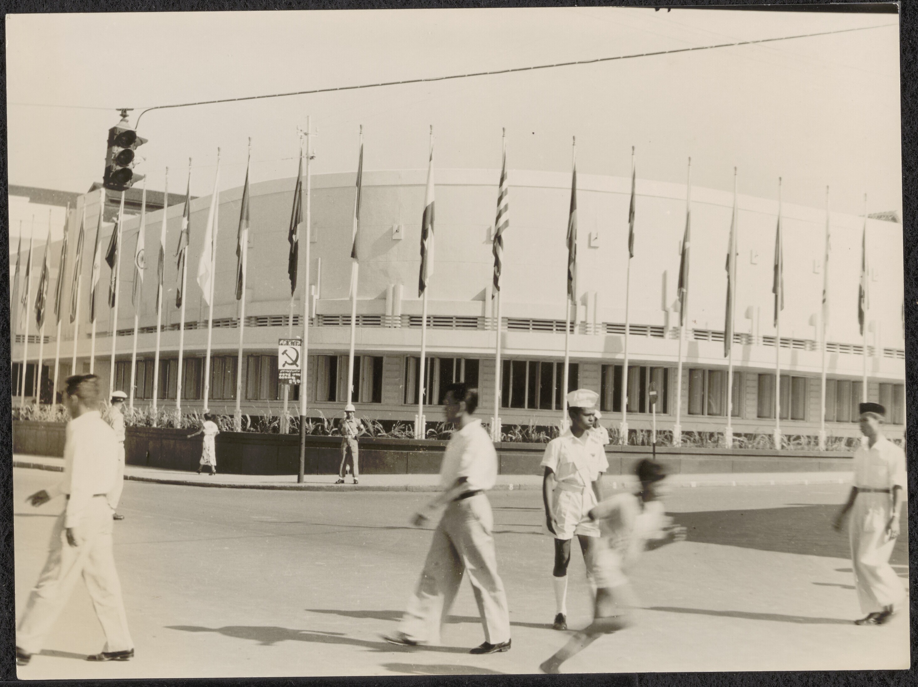 Portret van een gezelschap voor het kantoorgebouw va...