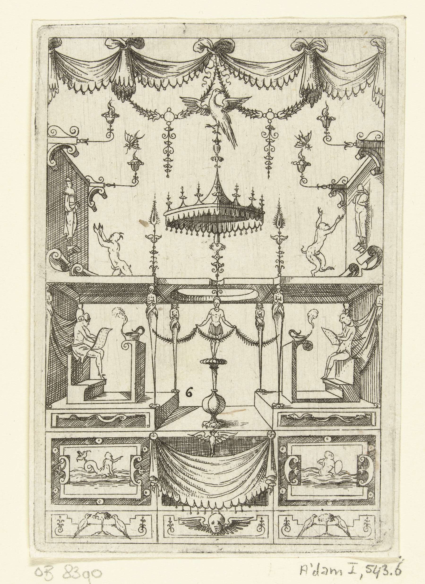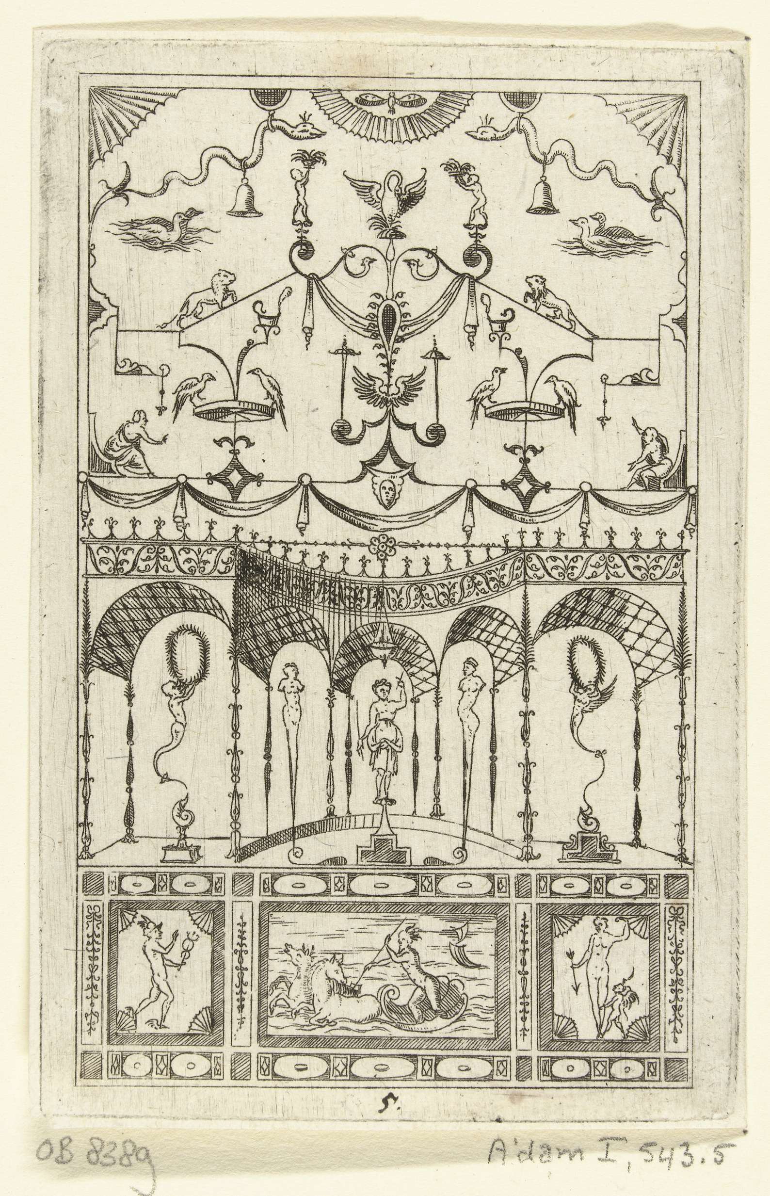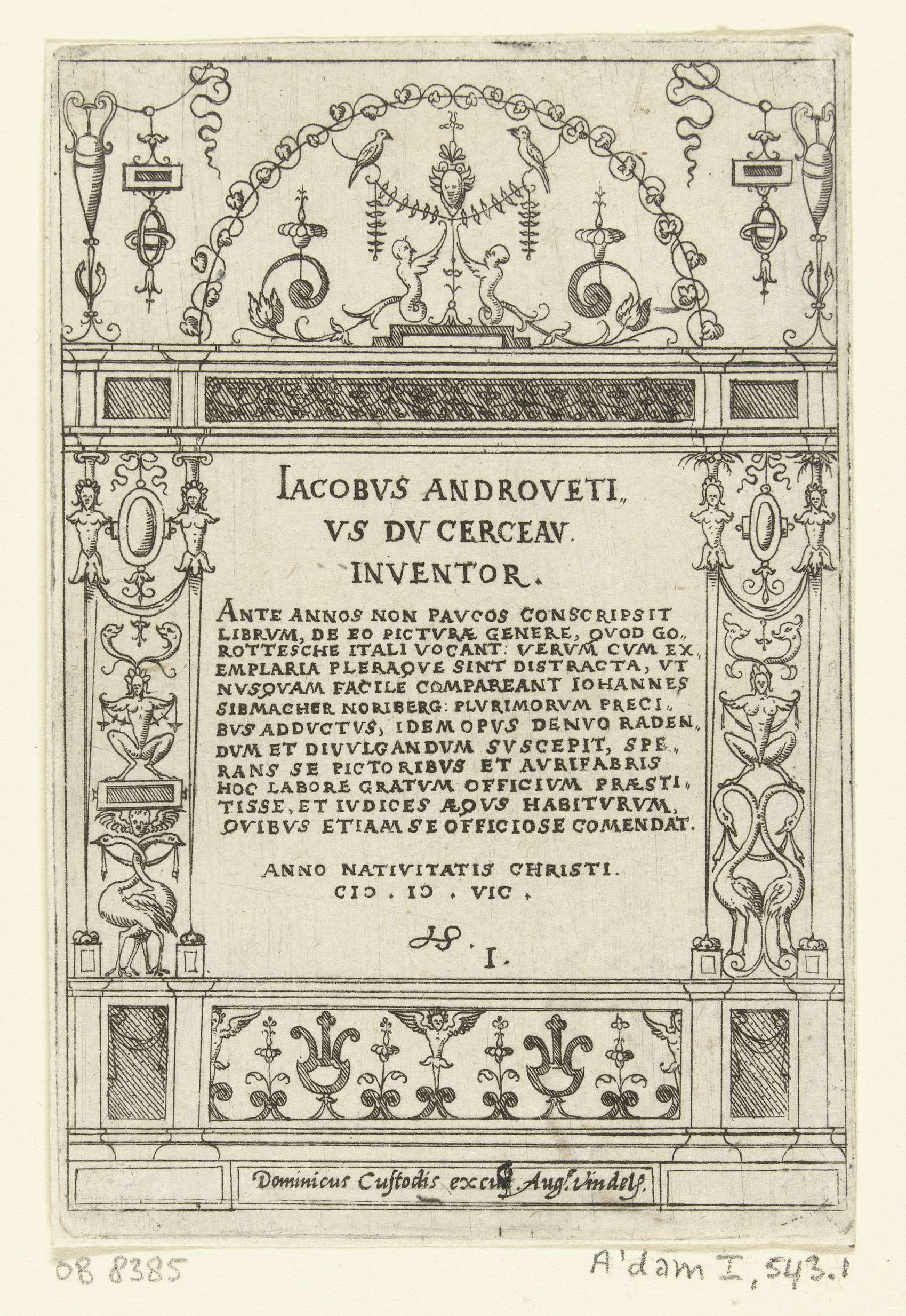 Titelblad met inscriptie, omlijst door kandelabers e...