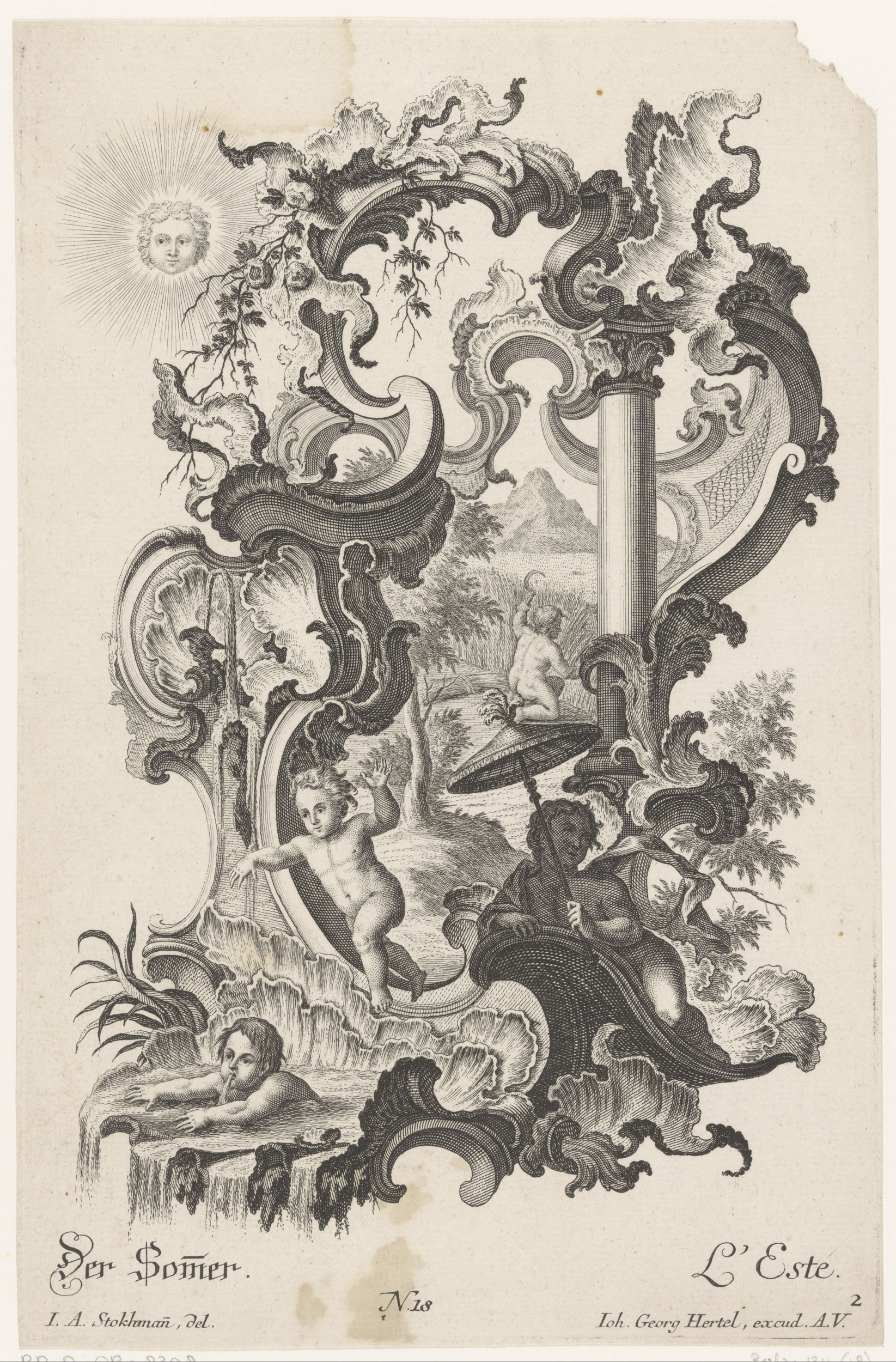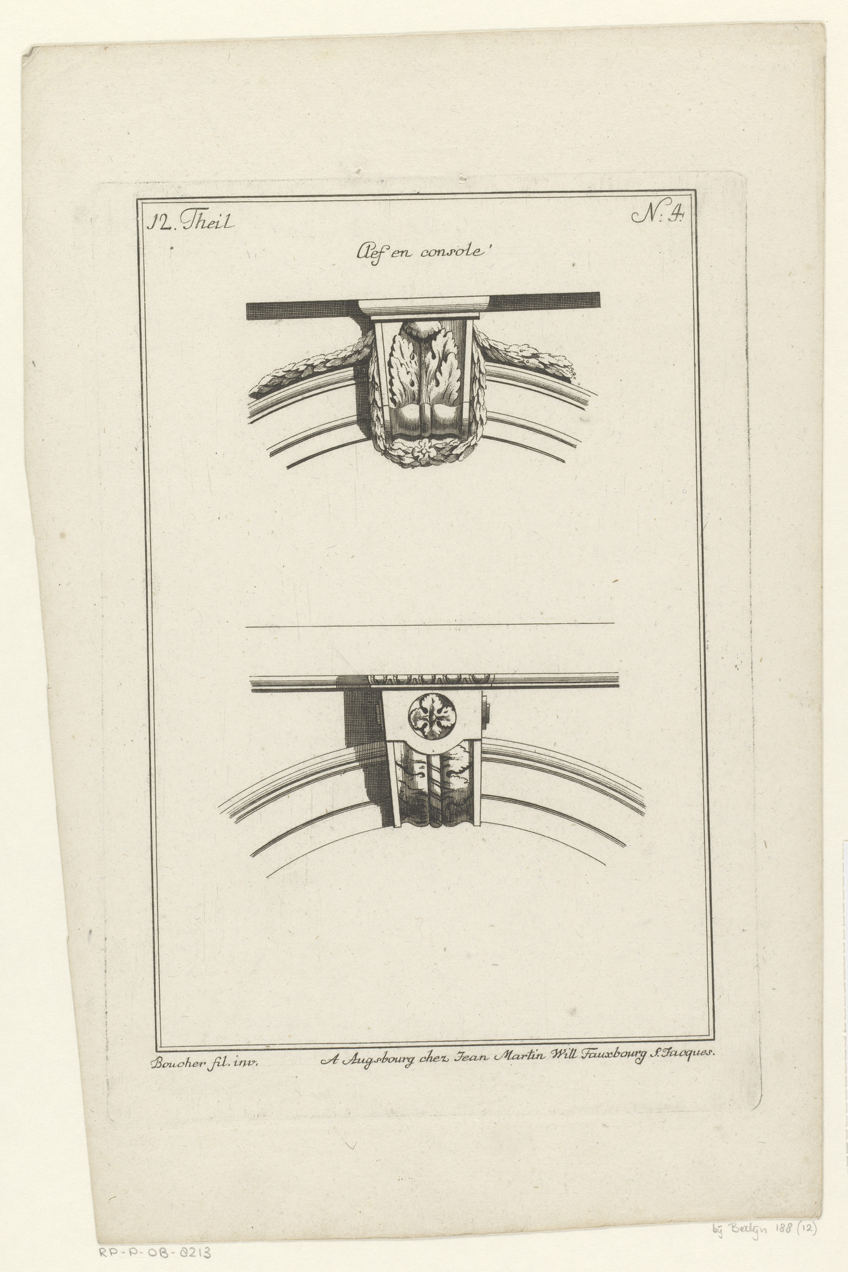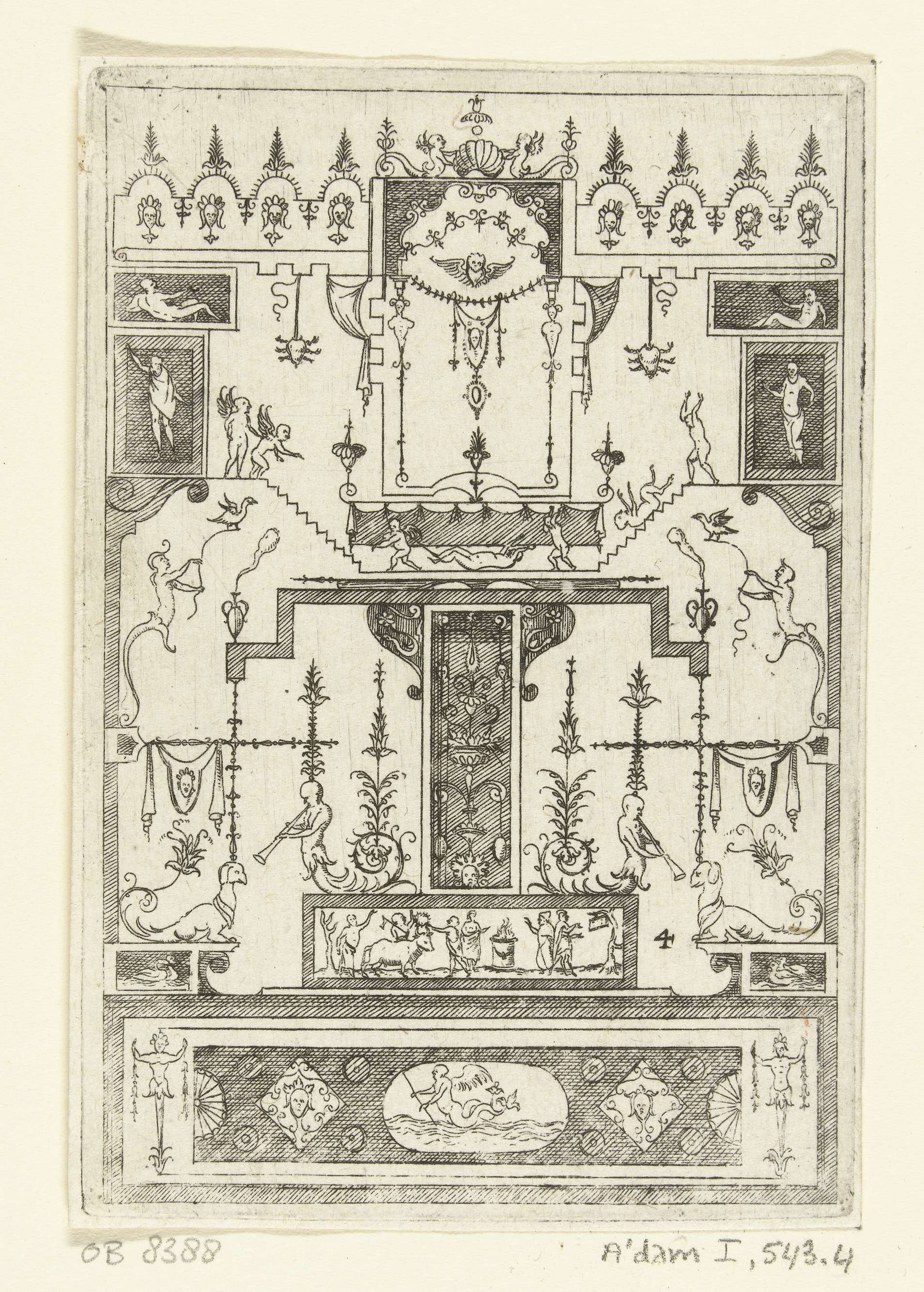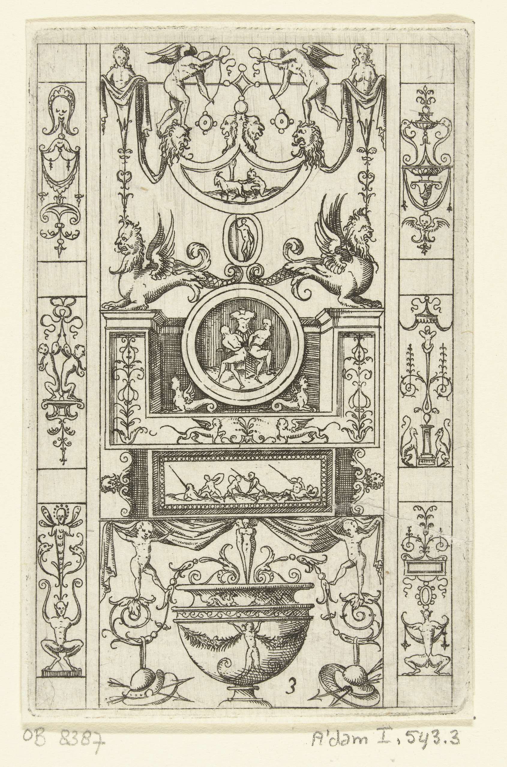Titelblad met inscriptie, omlijst door kandelabers e...