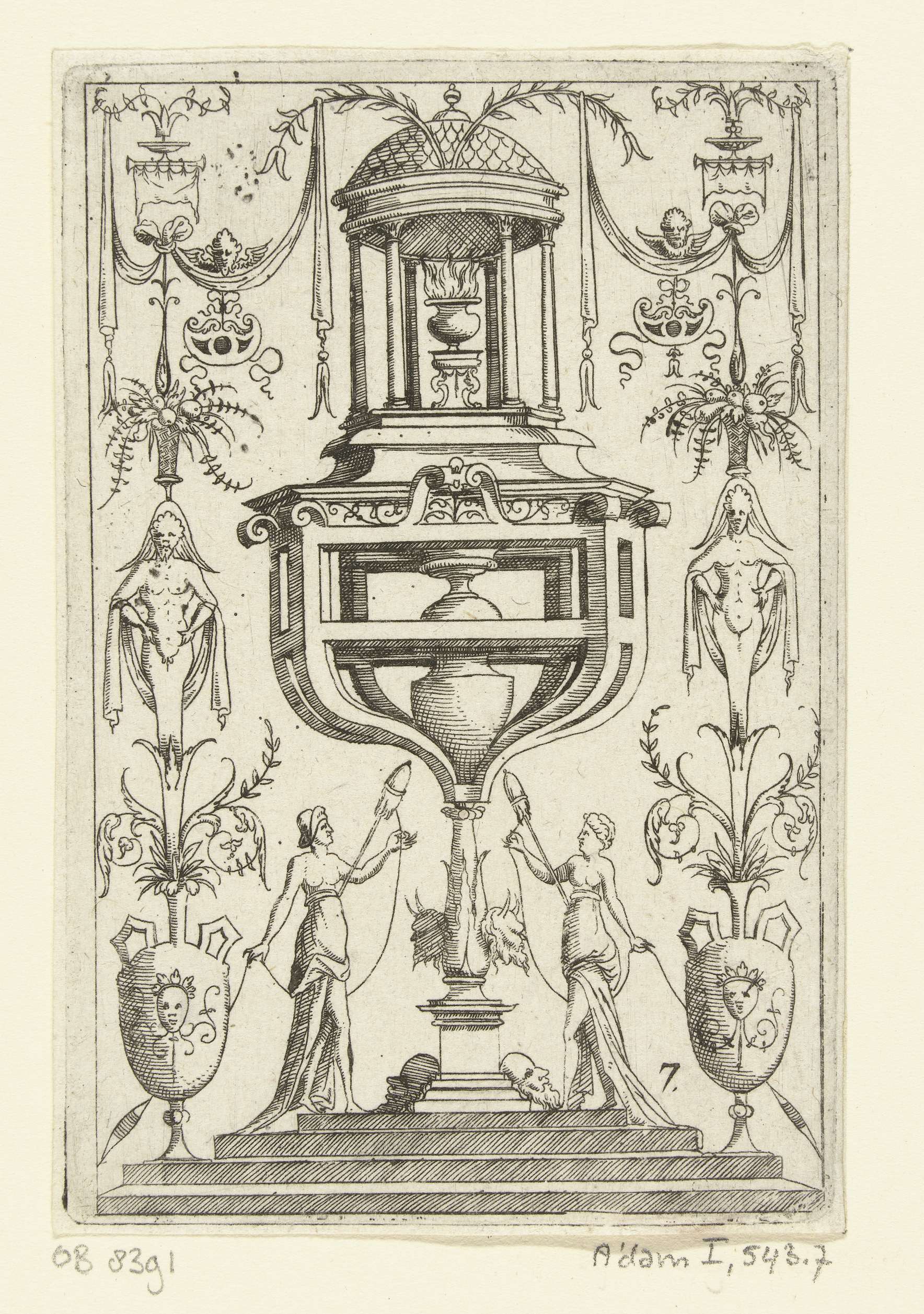 Kandelaber, geflankeerd door zes kleine vlakdecorati...