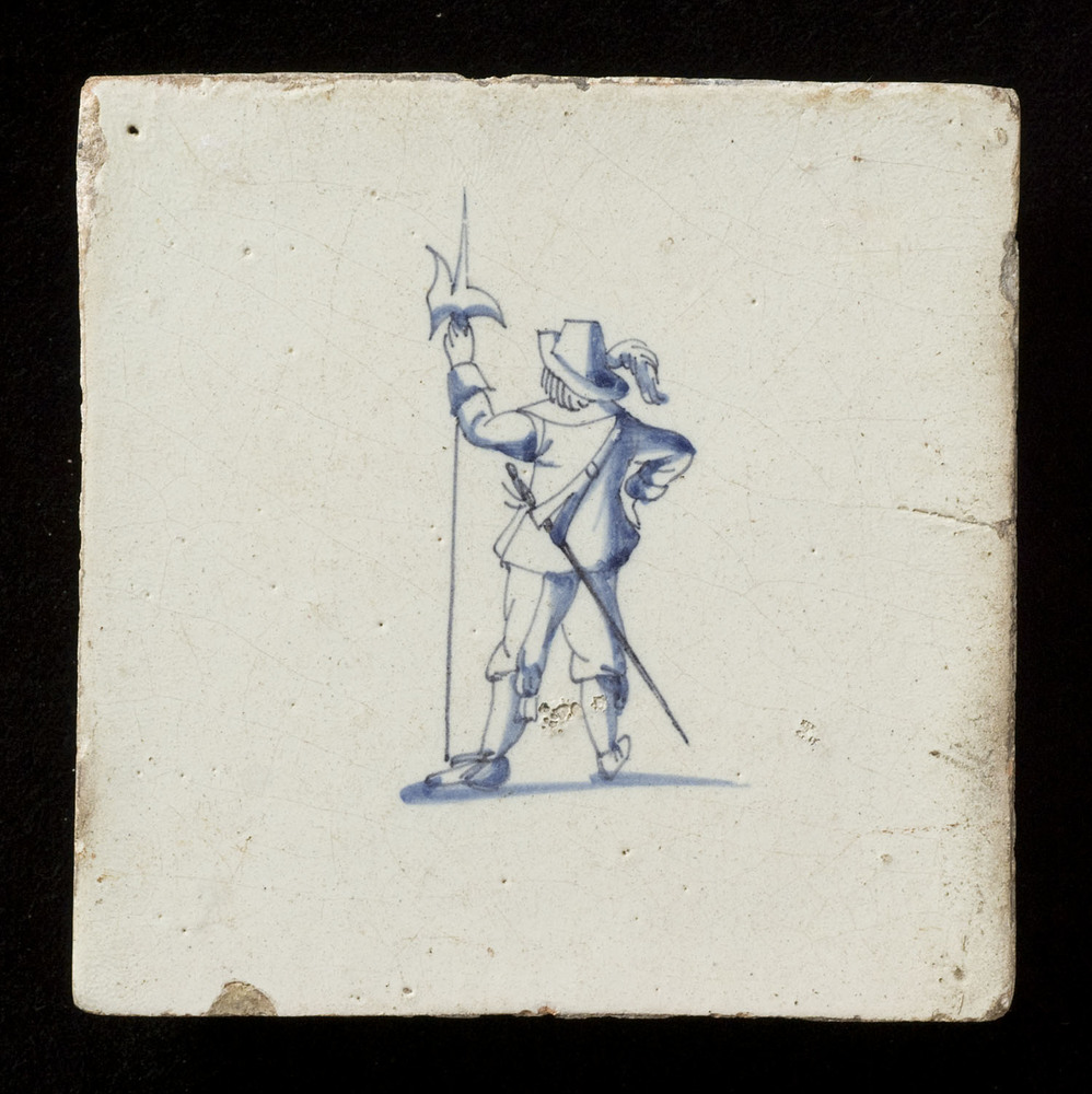 Tegel in tinglazuur, voorstellende hellebaardier, st...