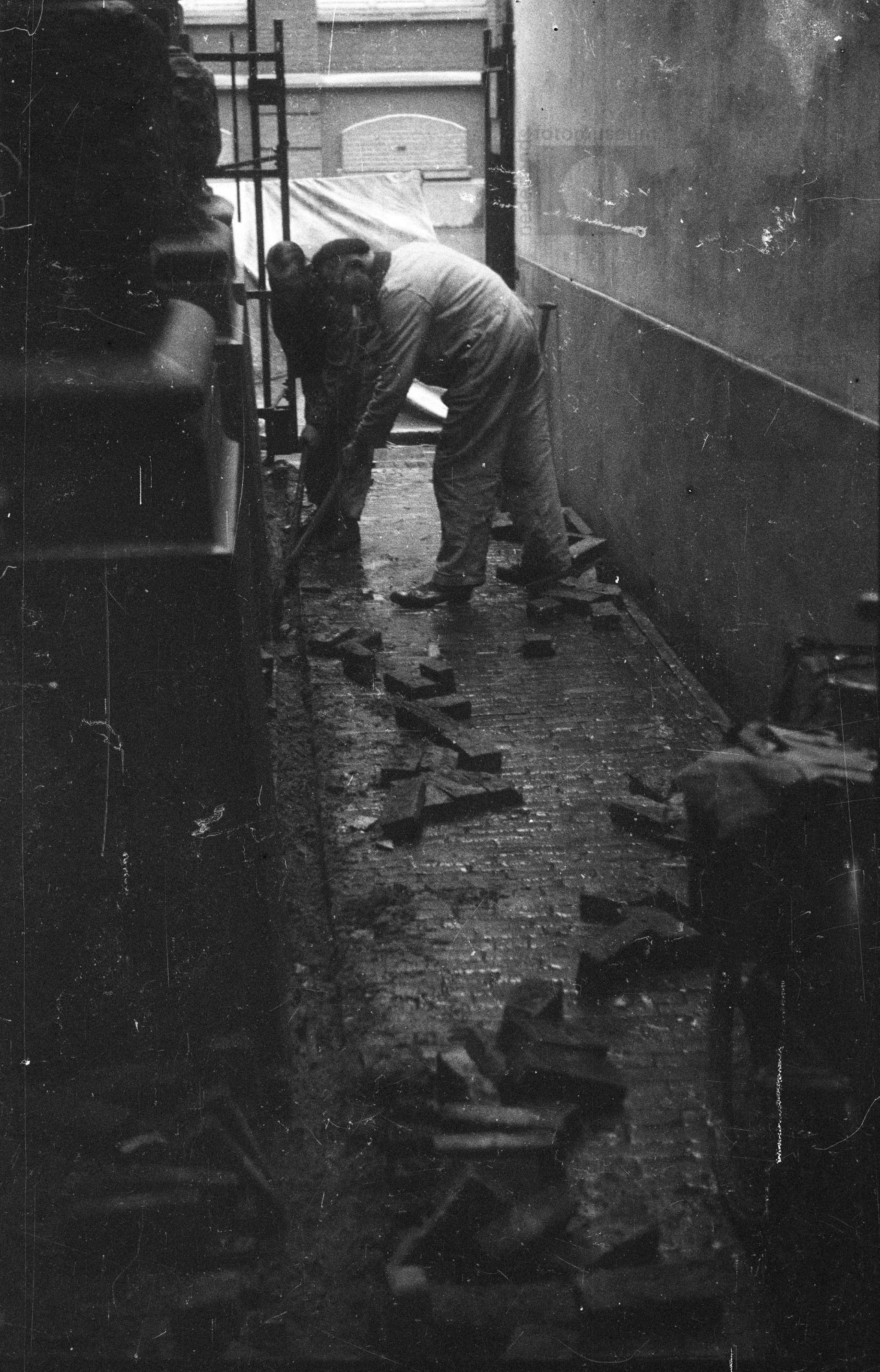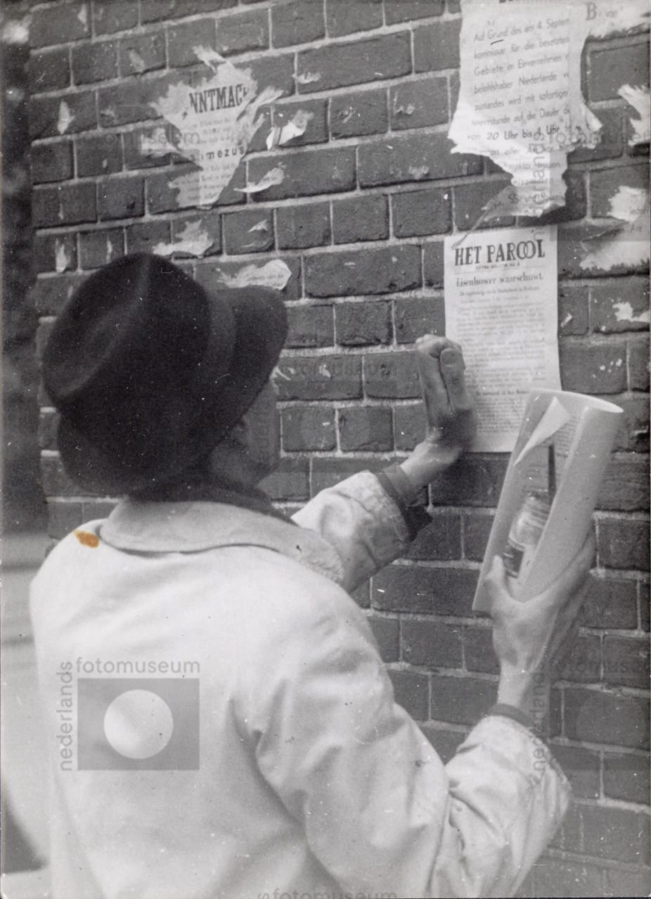 Het plakken van een muurkrant van Het Parool, Amster...