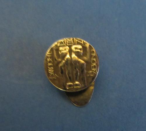 Draagspeld van zilver. Twee gestileerde mannen, met...