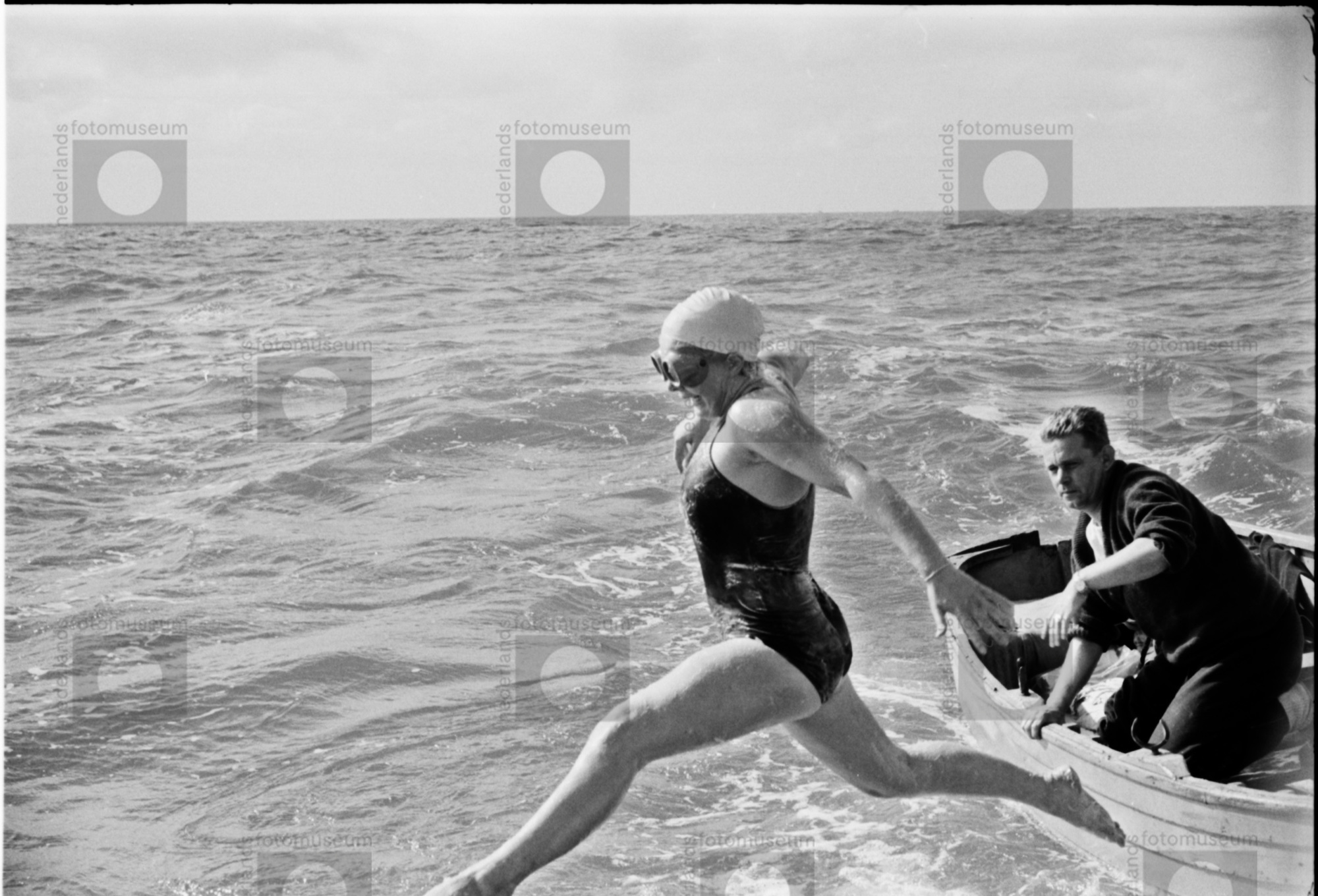 Mary Kok sprong in het water badpak Kanaalrace marat...