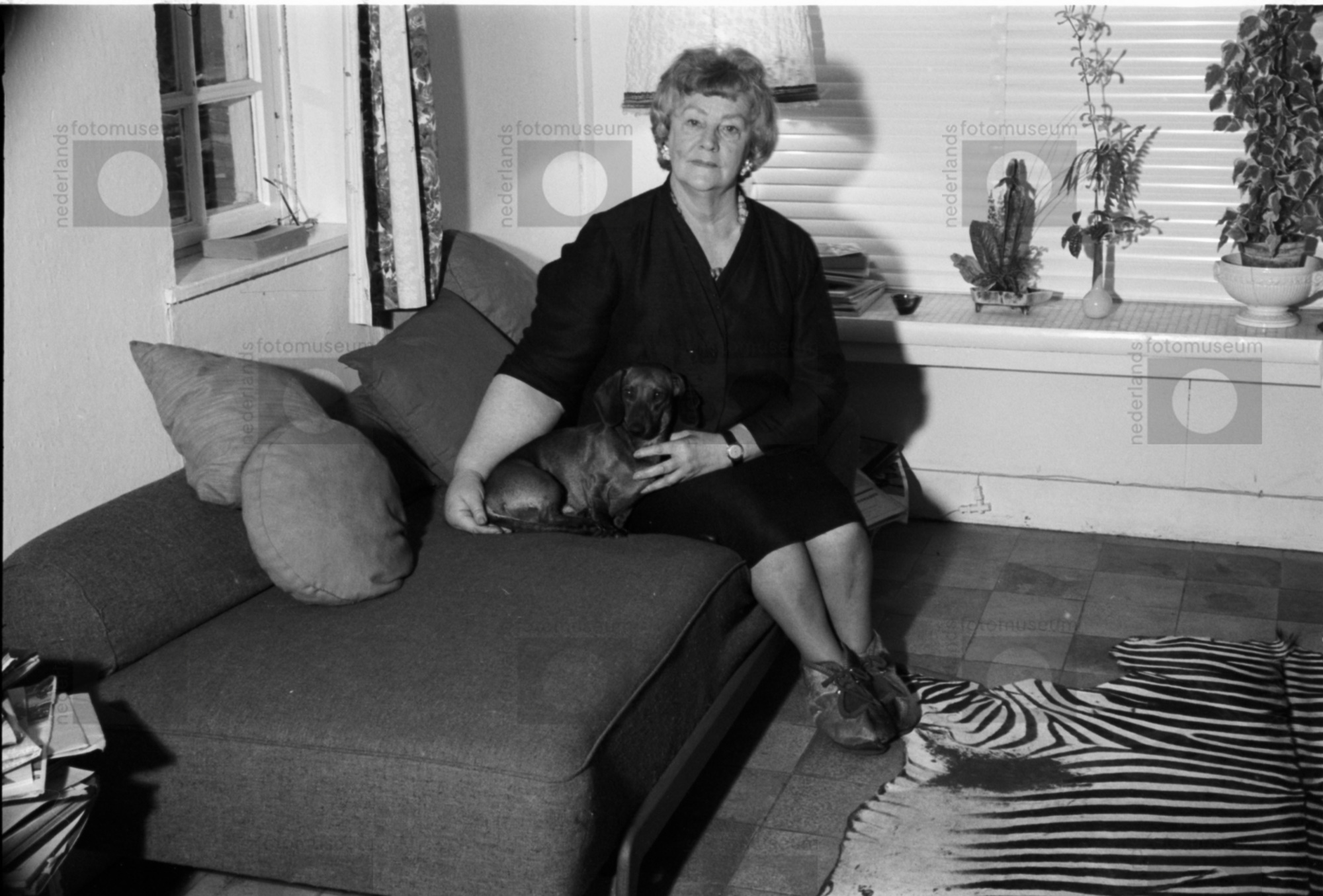 Stien Eelsingh met hond op bank, Staphorst