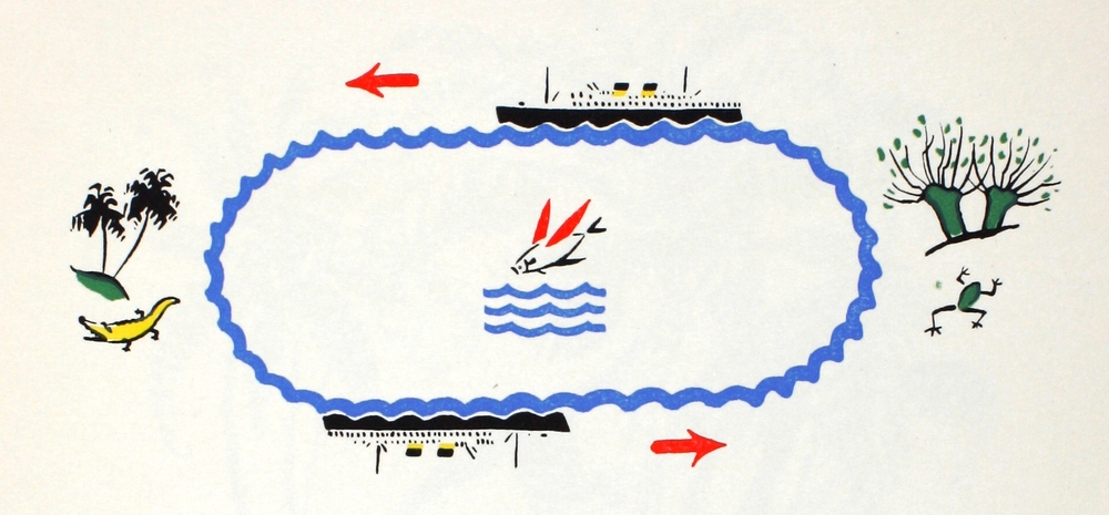 Illustratie door Jo Spier van een boot die een route...